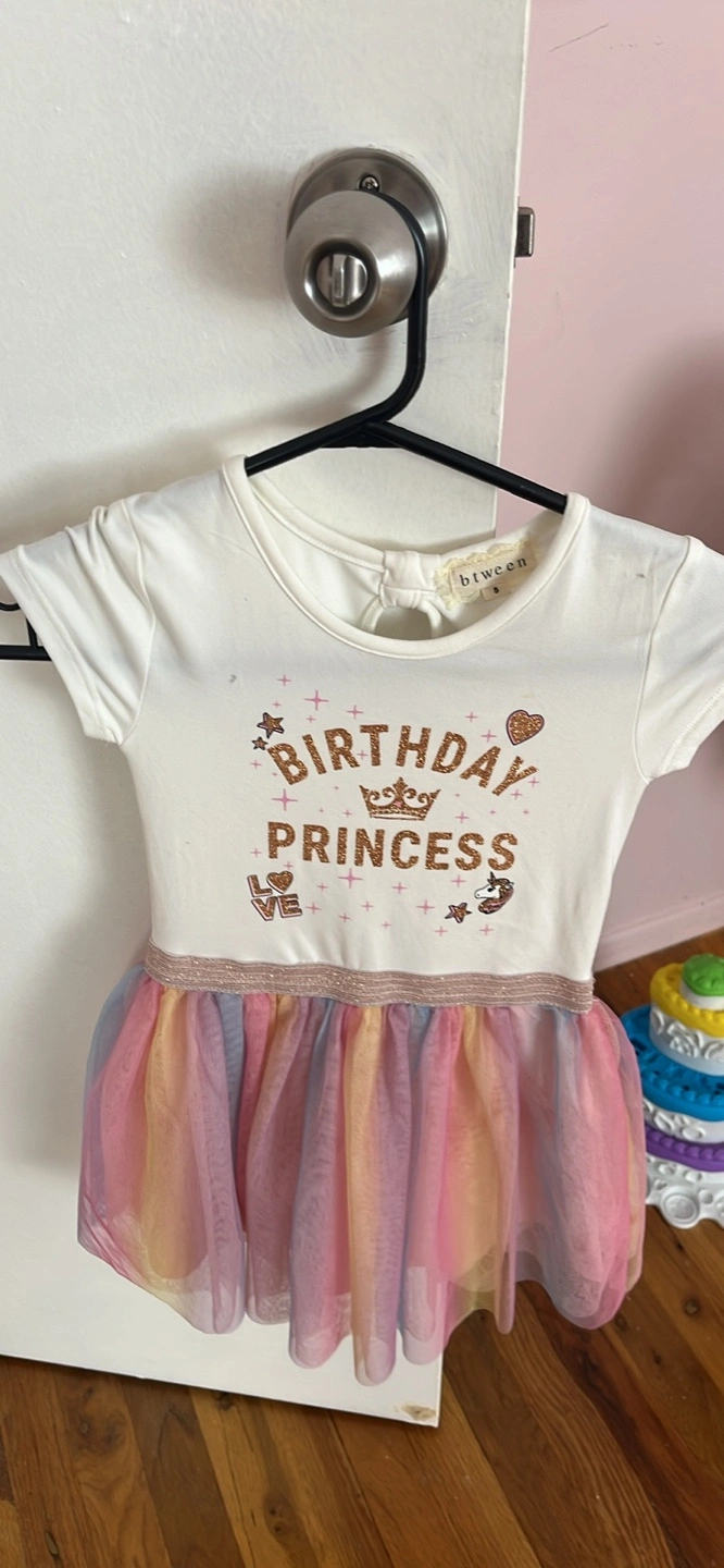 This is a cute btween brand dress, perfect for a little princess! It's a size 5 and features a 'Birthday Princess' design on the top with a colorful rainbow tulle skirt
