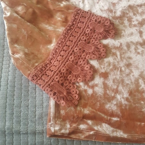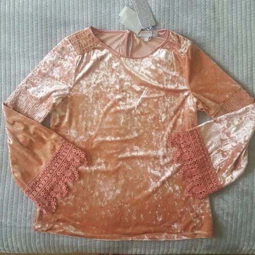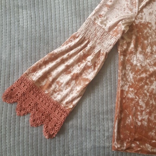 Daniel Rainn Women Rose Velvet Flared Long Sleeve Blouse Crochet Trim Size S. Condition is New with tags. Feel free to message if you have any questions!
