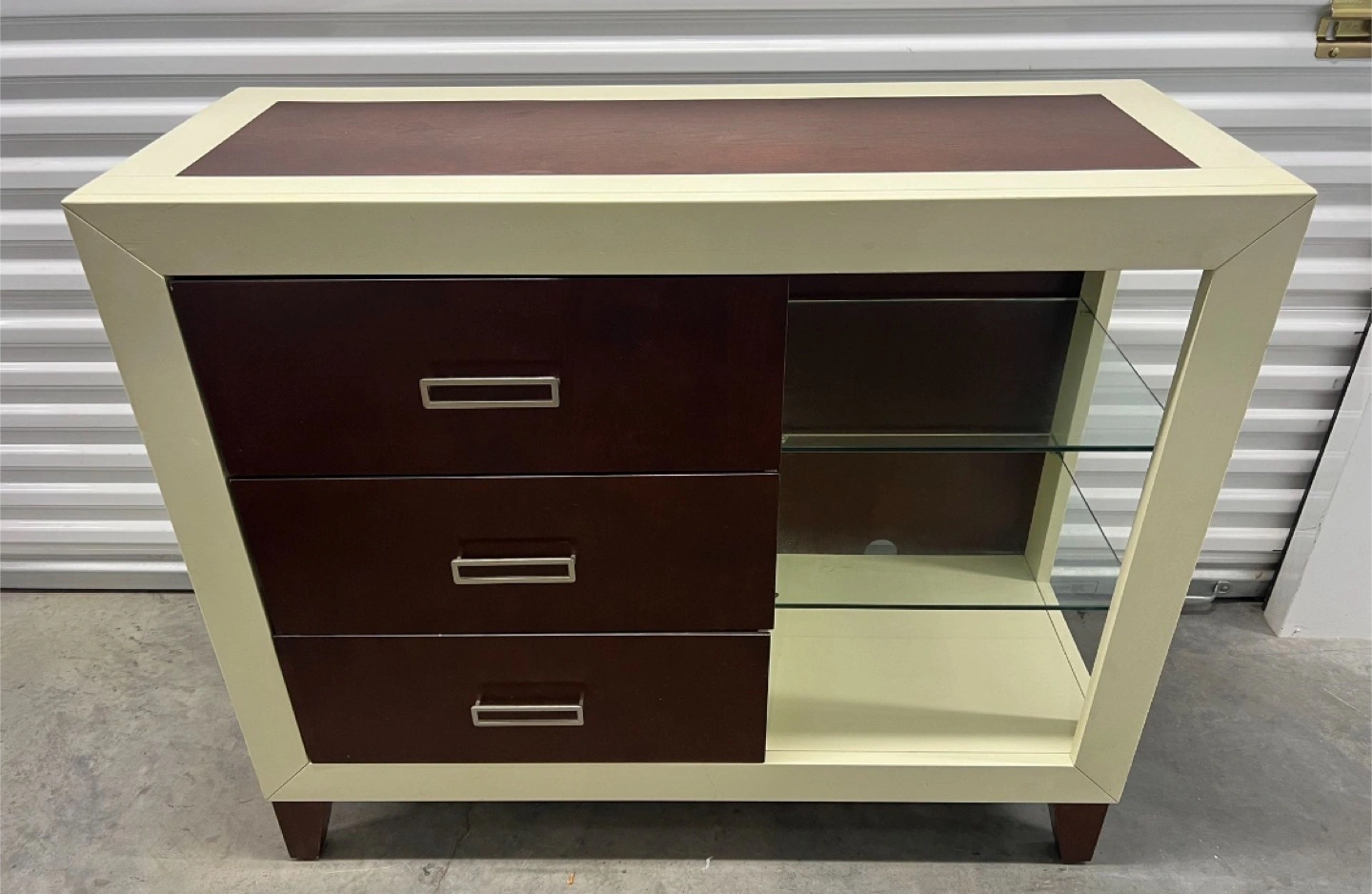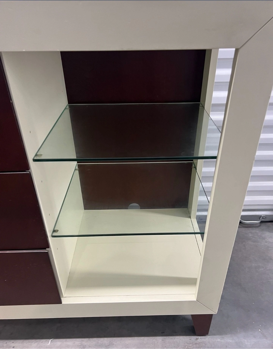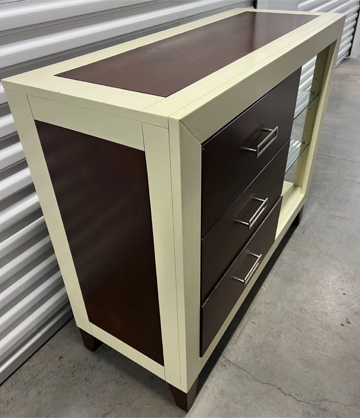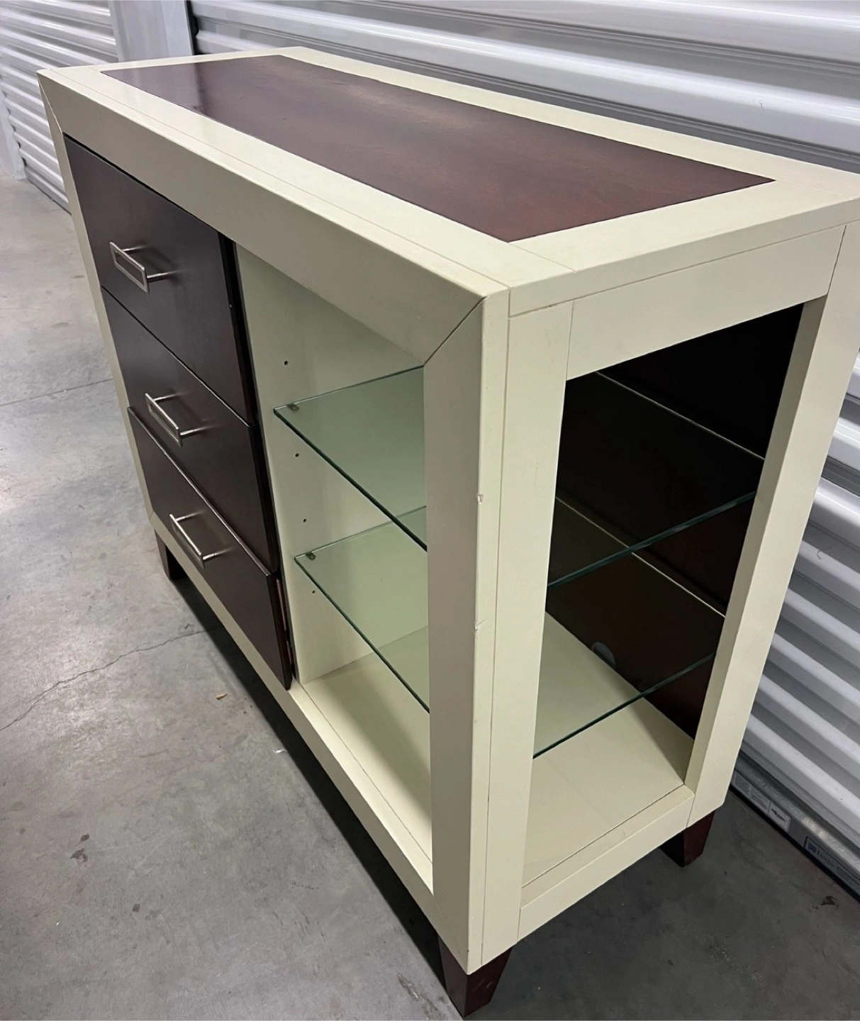 73Modern style media console. Features a two-tone design with dark brown wood drawers and a lighter beige frame. Includes three drawers and two glass shelves. Ideal for living room or entertainment space.