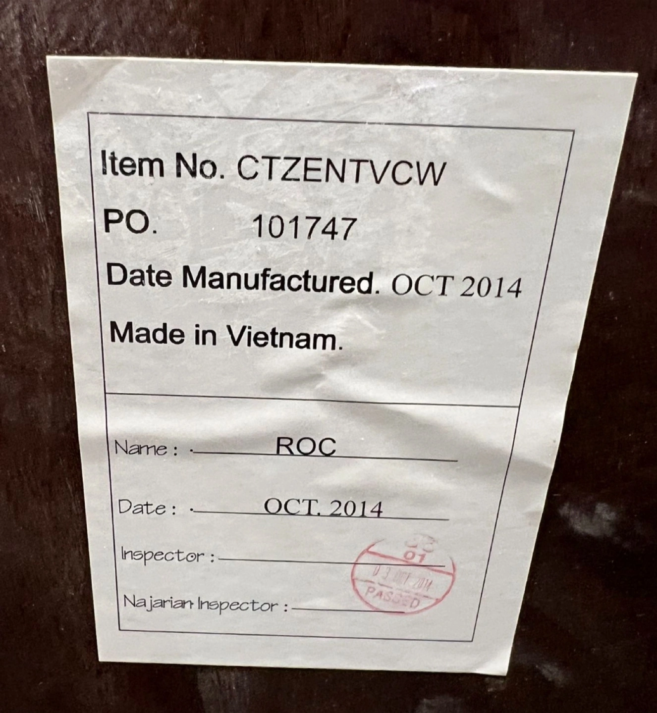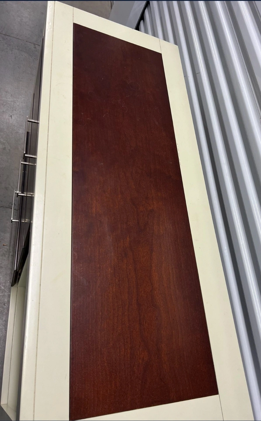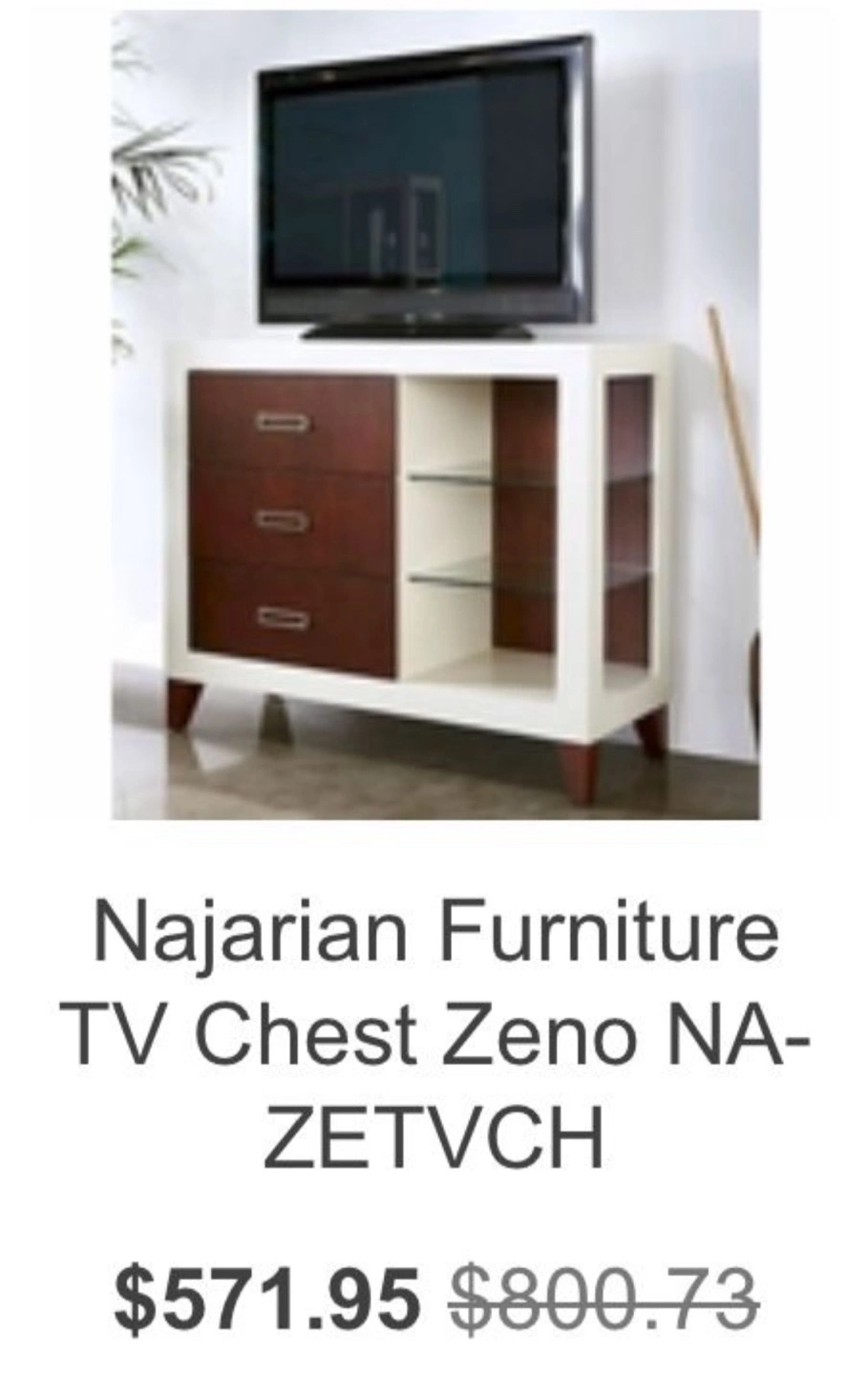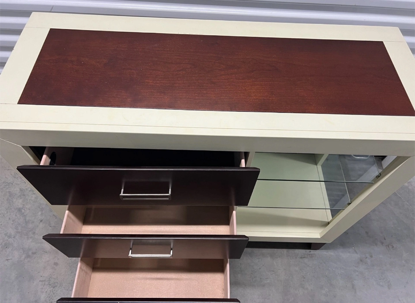 73Modern style media console. Features a two-tone design with dark brown wood drawers and a lighter beige frame. Includes three drawers and two glass shelves. Ideal for living room or entertainment space.