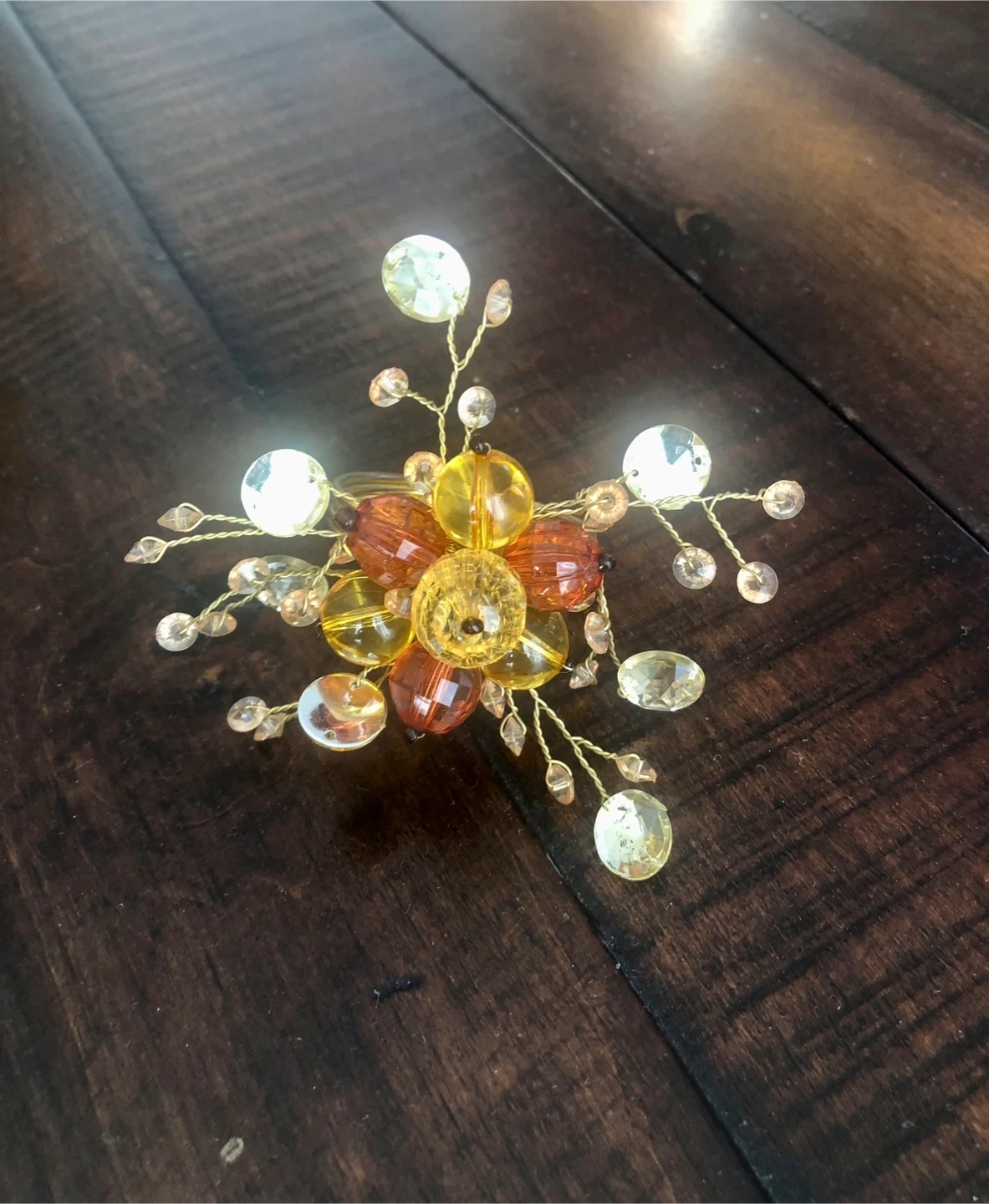 Here are four beaded napkin rings. They are gold with orange, yellow, and clear beads. They would be perfect for a fall or Thanksgiving table setting!