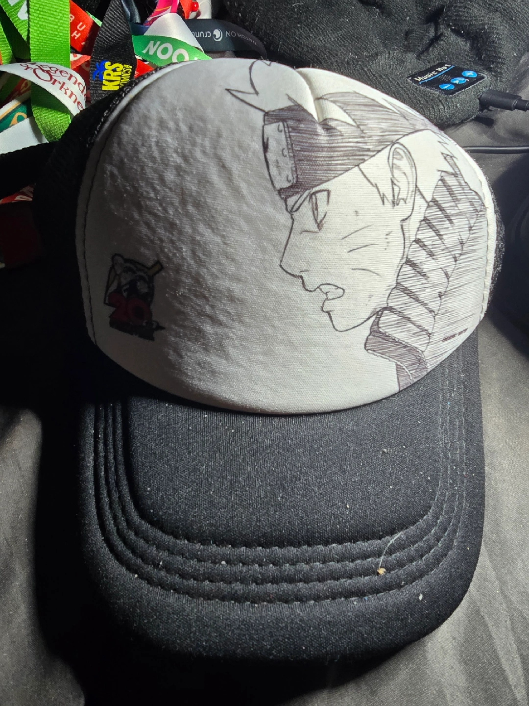 15Selling a cool Naruto themed trucker hat! The front features a drawing of Naruto Uzumaki. The back is a black mesh.