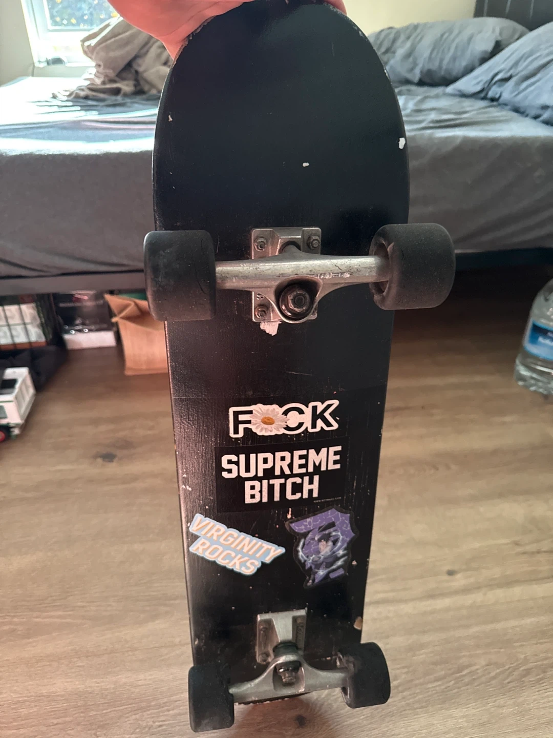 65Selling a used skateboard. It has some wear and tear, but it's still in good condition for cruising around. The grip tape features a Naruto design.