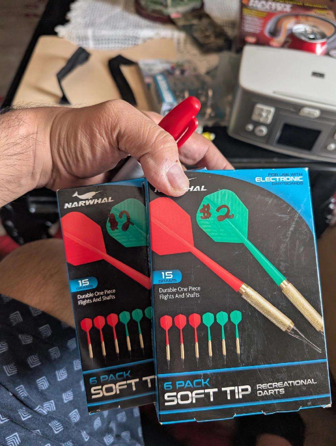 I'm selling two packs of Narwhal soft tip darts! Each pack contains 6 darts, perfect for recreational use with electronic dartboards. They're 15 grams each and feature durable one-piece flights and shafts