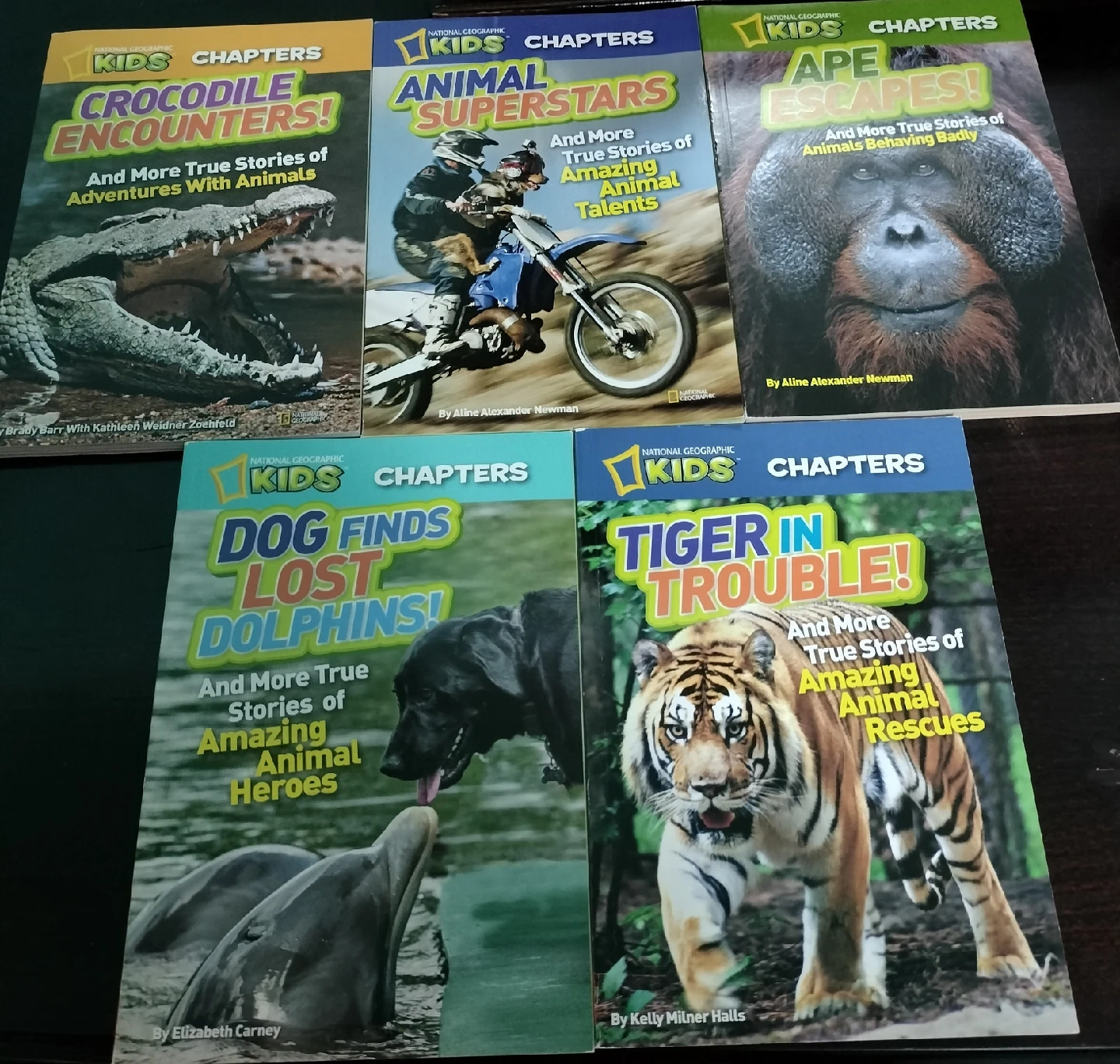 10Selling a set of National Geographic Kids Chapters books! Titles include: - Crocodile Encounters! - Animal Superstars - Ape Escapes! - Dog Finds Lost Dolphins! - Tiger in Trouble! Great for young readers interested in animals and adventures Books are used, in good condition. No writing inside, no missing pages