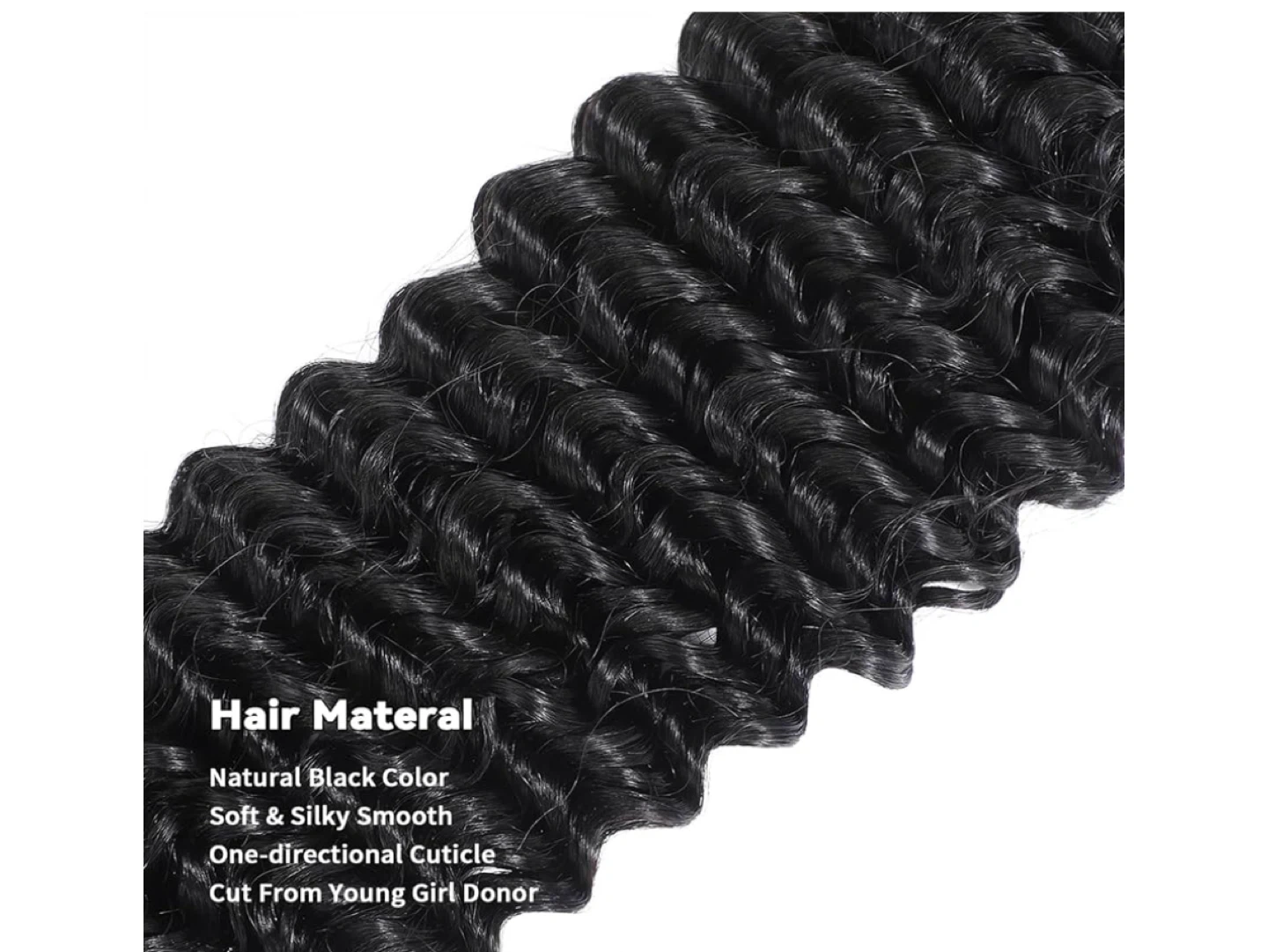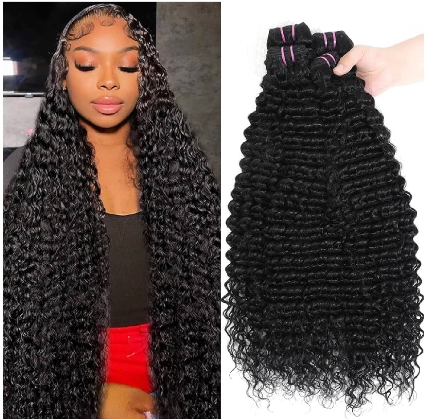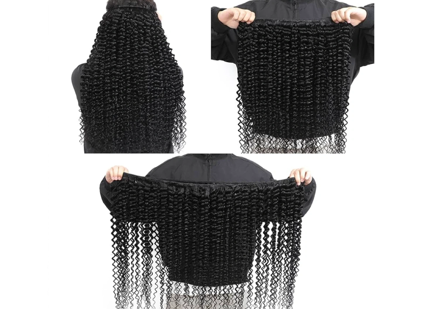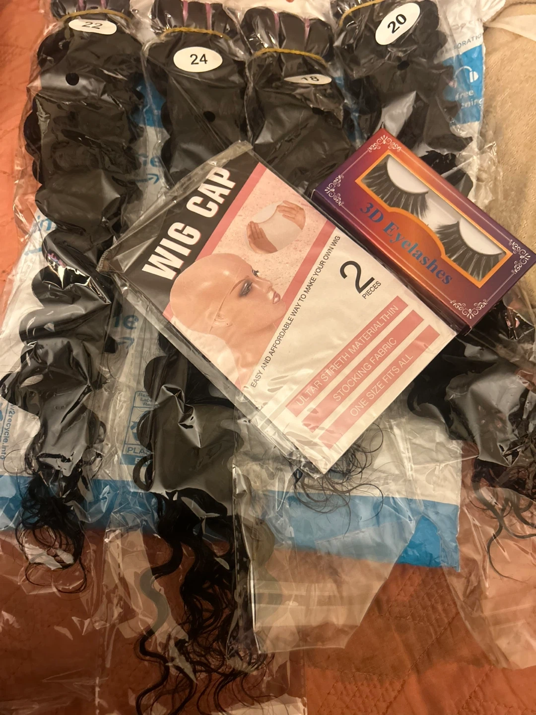 I'm selling natural black curly hair extensions. The hair is soft and silky smooth with a one-directional cuticle. Included are some wig caps and 3D eyelashes