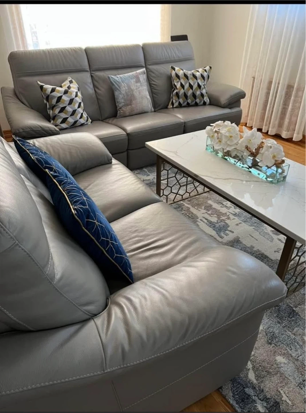 Selling a comfortable gray leather reclining sofa set. It's in good condition and perfect for a living room or entertainment area. The set includes a sofa and a loveseat, both with reclining features.