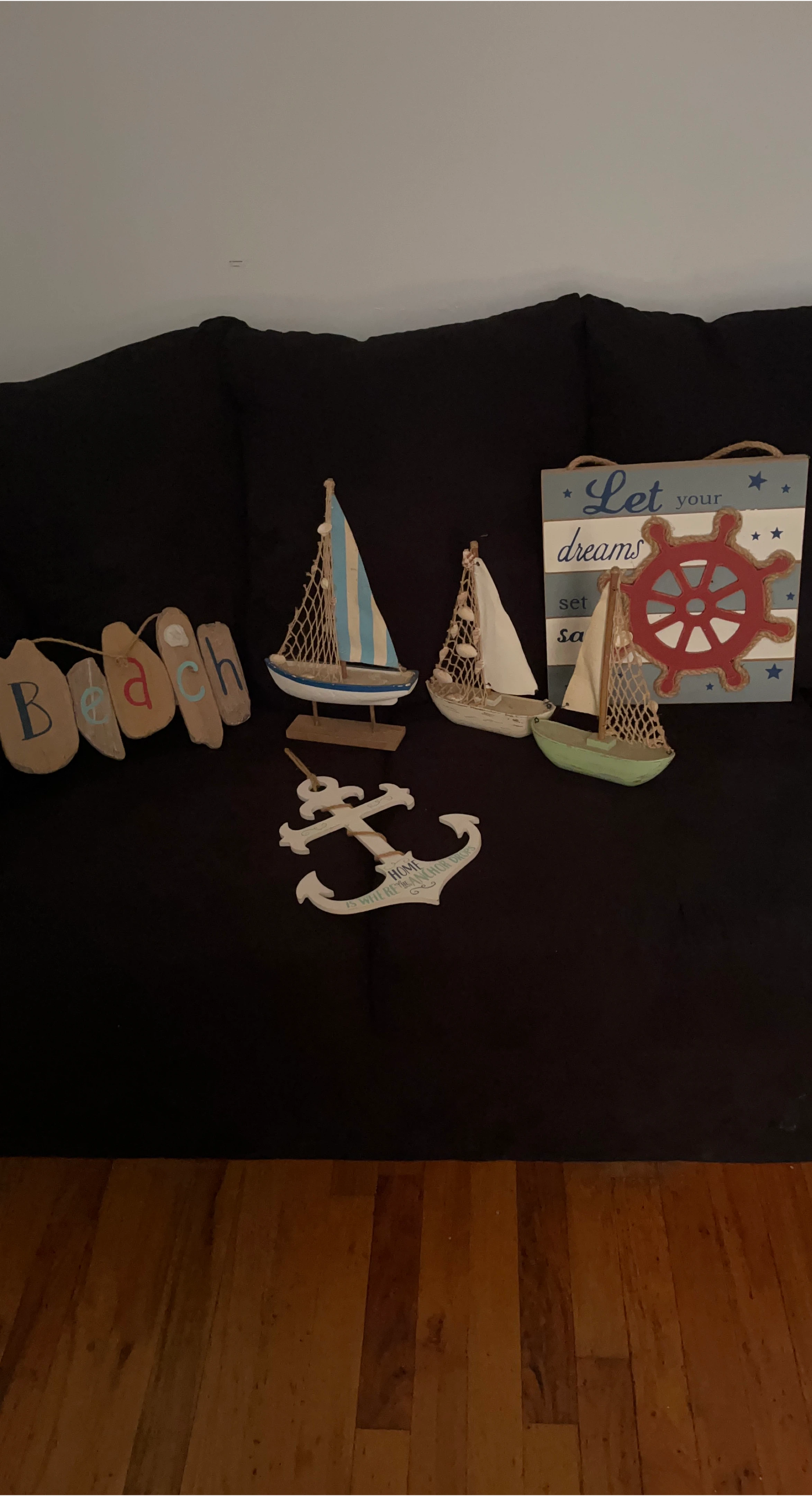60Selling a cute nautical decor set! Includes wooden sailboats, an anchor, and a sign with a ship's wheel. Perfect for adding a beachy touch to your home
