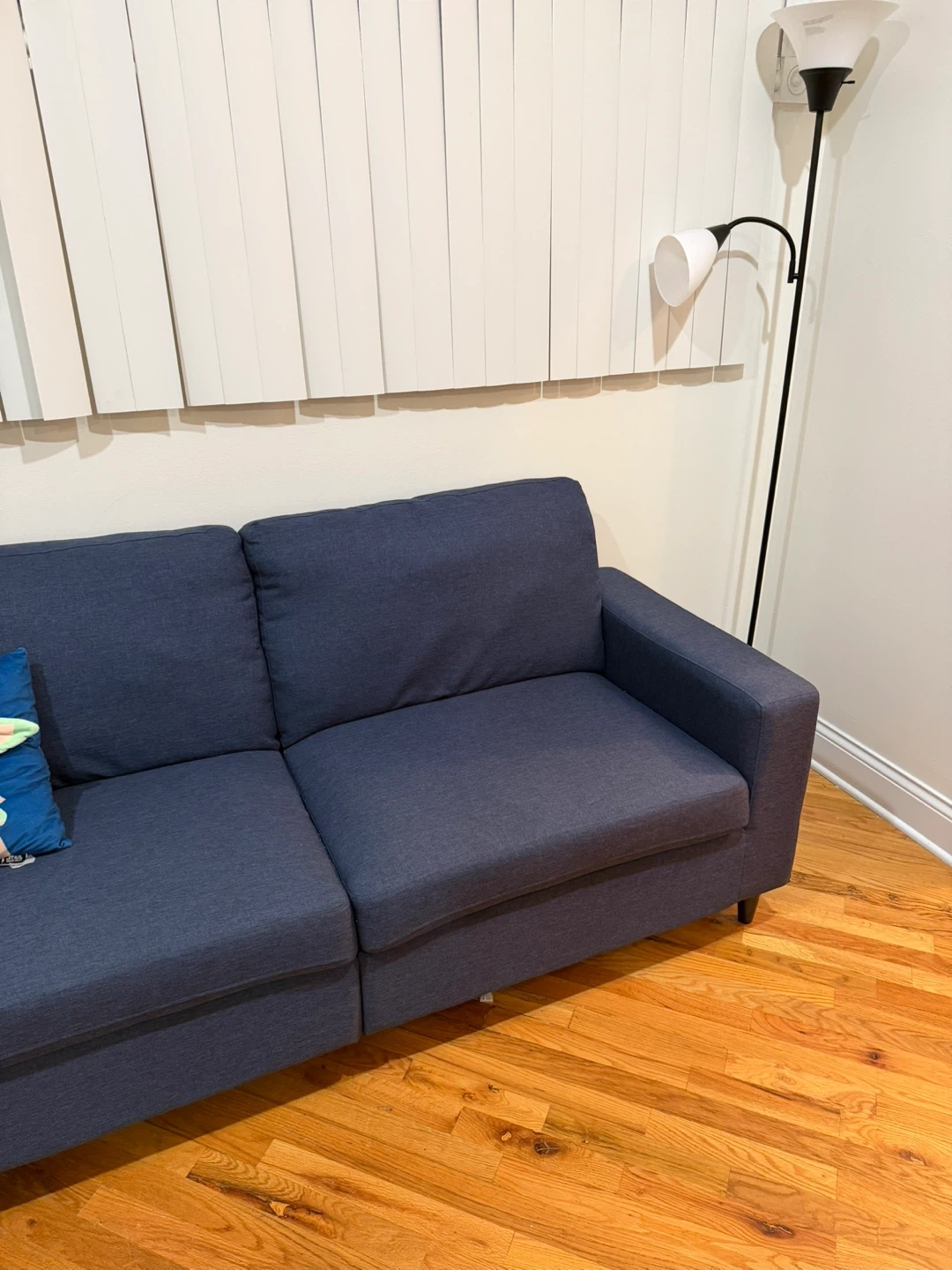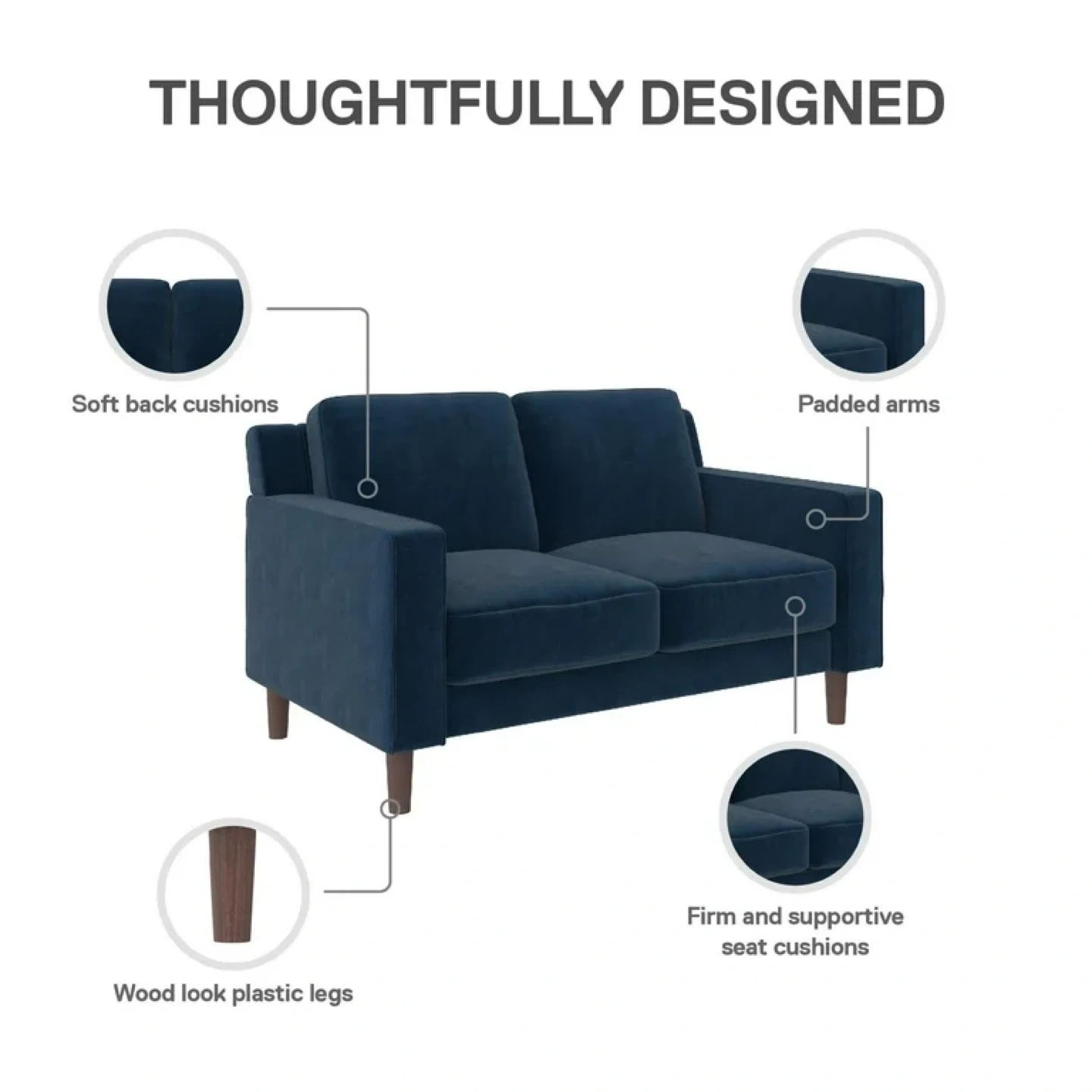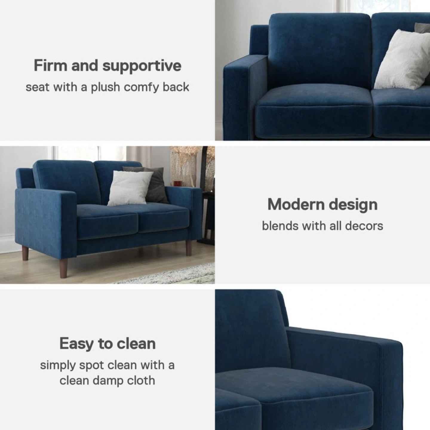 65This navy blue sofa features a modern design that blends well with all decors. It has a firm and supportive seat with a plush comfy back. The soft back cushions and padded arms add to the comfort, and it's easy to clean. The legs are made of wood-look plastic