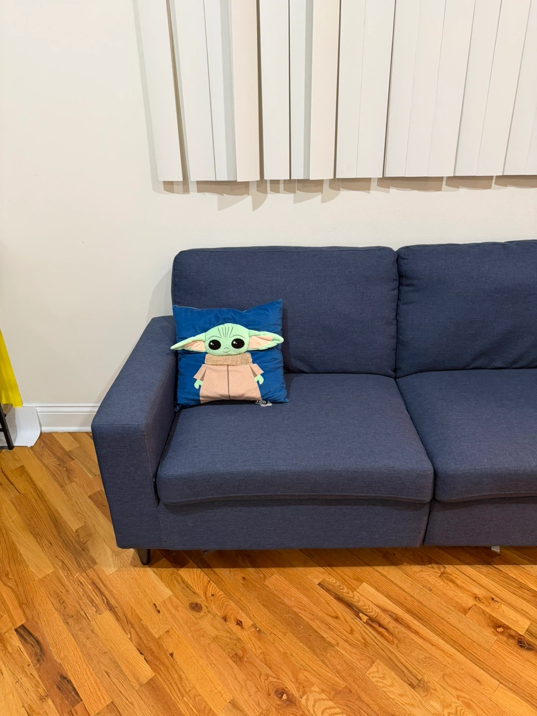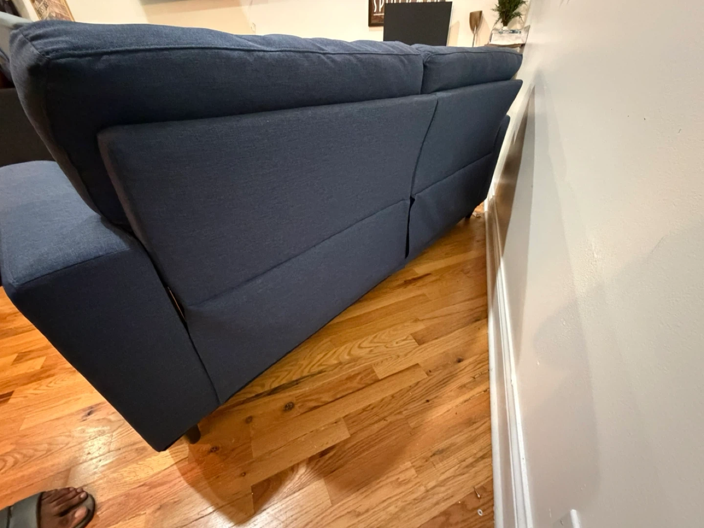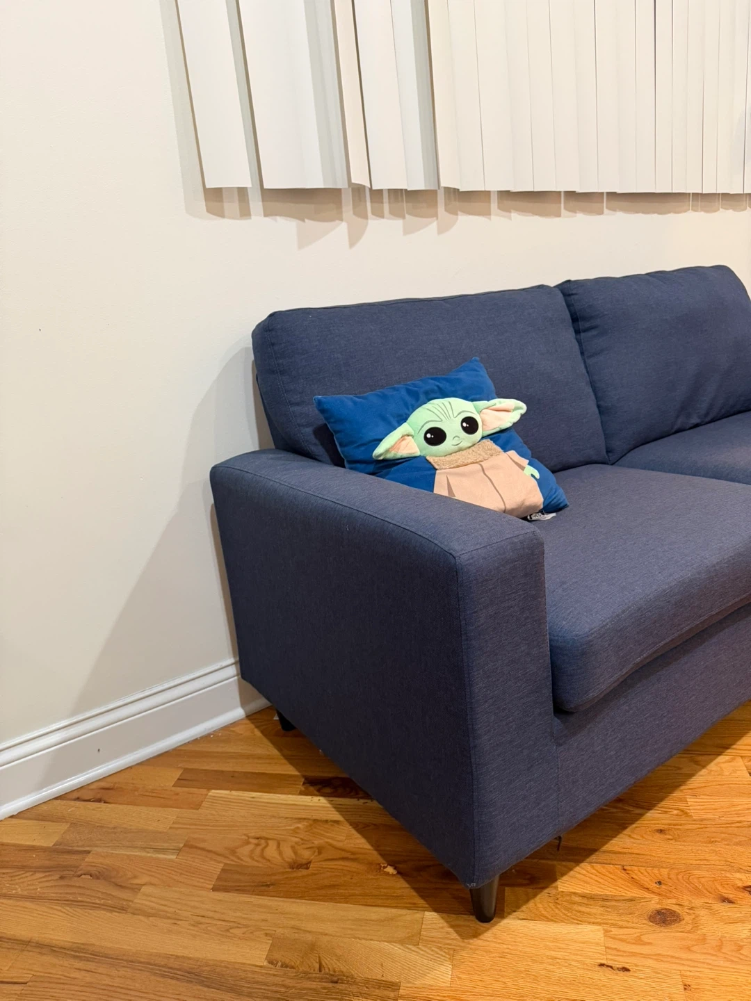 65This navy blue sofa features a modern design that blends well with all decors. It has a firm and supportive seat with a plush comfy back. The soft back cushions and padded arms add to the comfort, and it's easy to clean. The legs are made of wood-look plastic