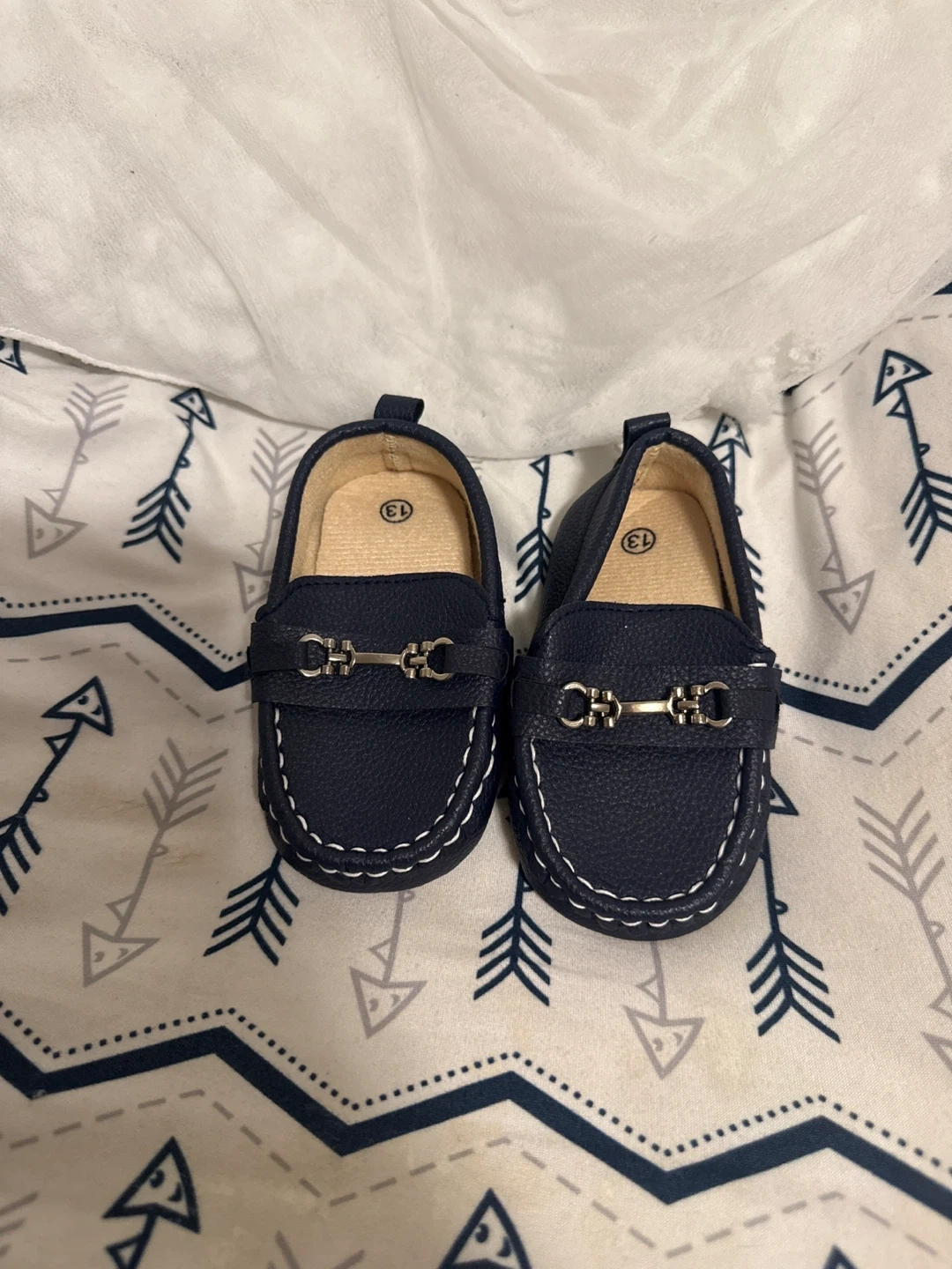 These adorable navy blue baby loafers are in great condition! They feature a classic design with a silver-tone buckle detail and white stitching. The size is marked as 13 inside the shoe, perfect for your little one