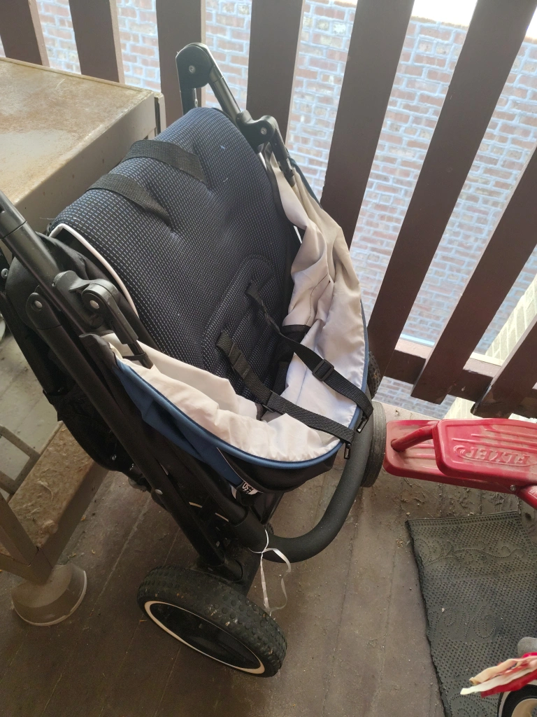 69FREE used baby stroller in navy blue. It features a black frame and a white interior lining. It's in good condition for taking your little one out and about