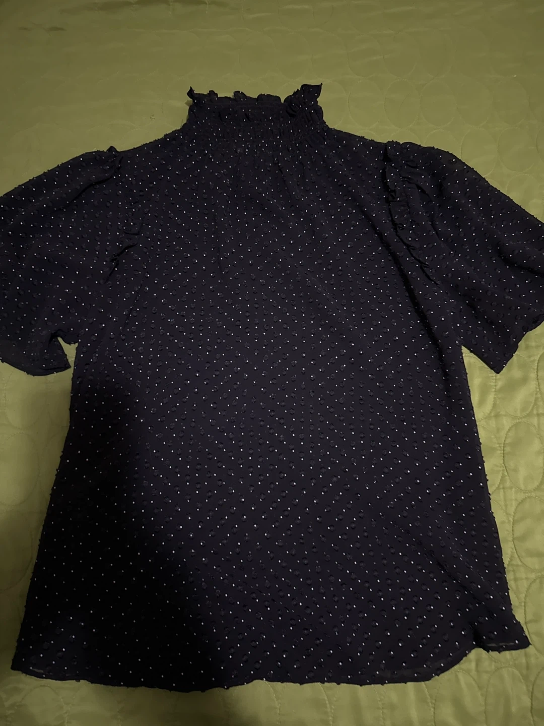 10This is a black blouse with a high ruffled neckline and short sleeves. It has a subtle dotted pattern throughout. Perfect for dressing up or down!