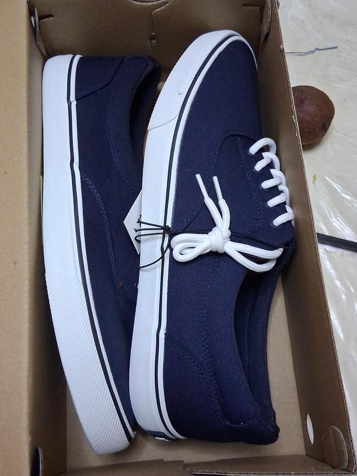 Selling a pair of navy blue canvas sneakers. They are brand new and come in the original box. These classic sneakers feature a clean design with white accents. Perfect for everyday wear!