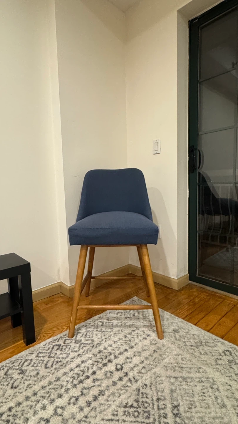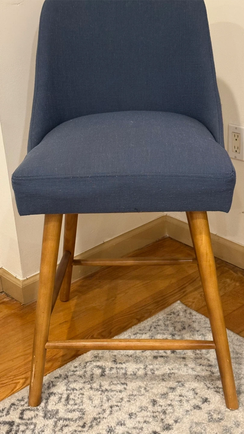 Here's a comfy counter stool with a navy blue upholstered seat and back. It has a sturdy wooden frame and legs, perfect for adding a touch of style to your kitchen or bar area. It's in fair condition. Pick up only Cash/Venmo only