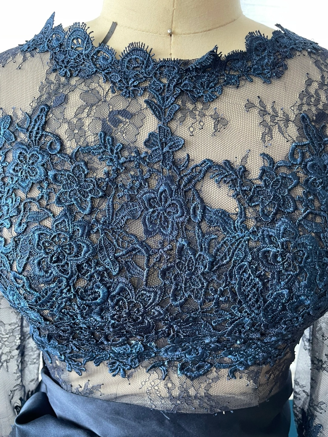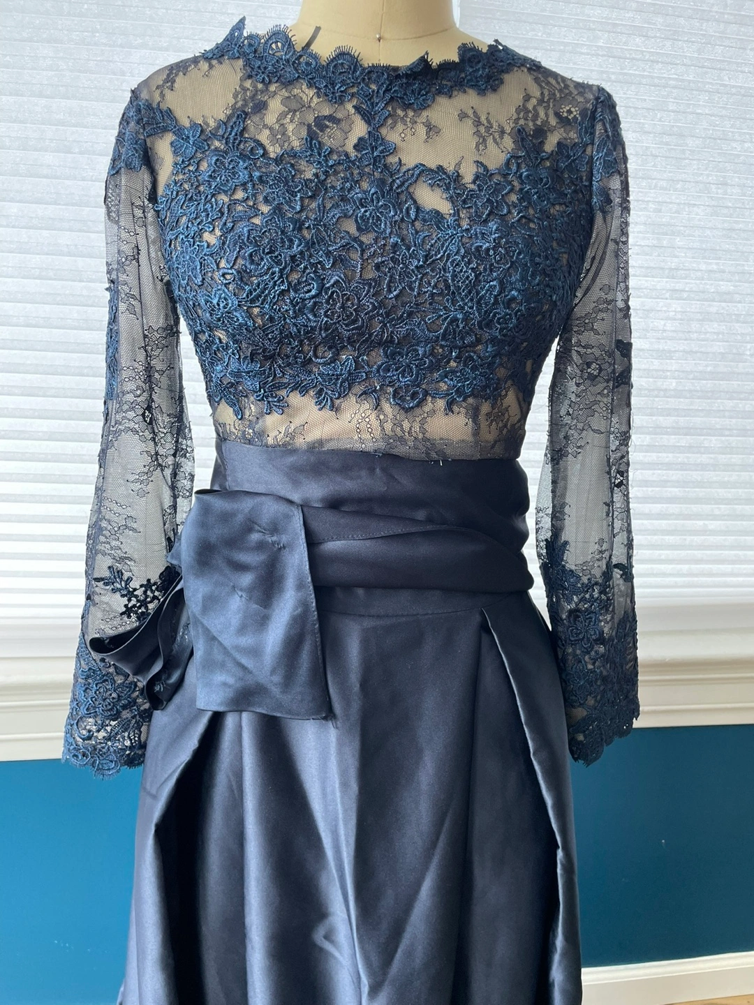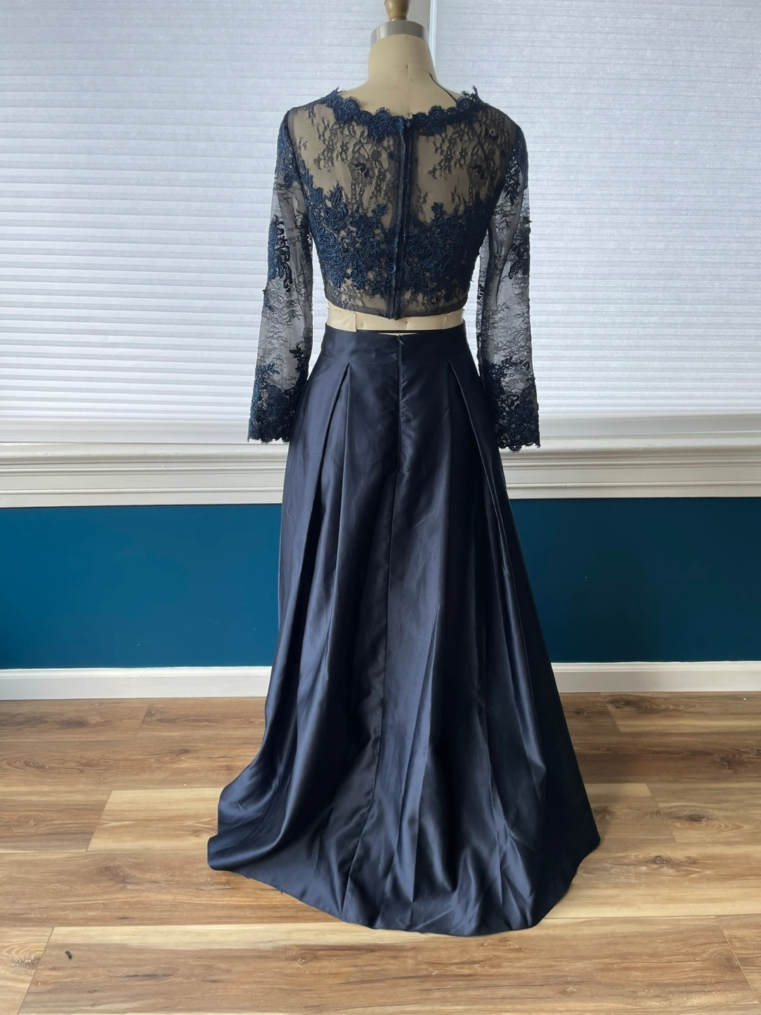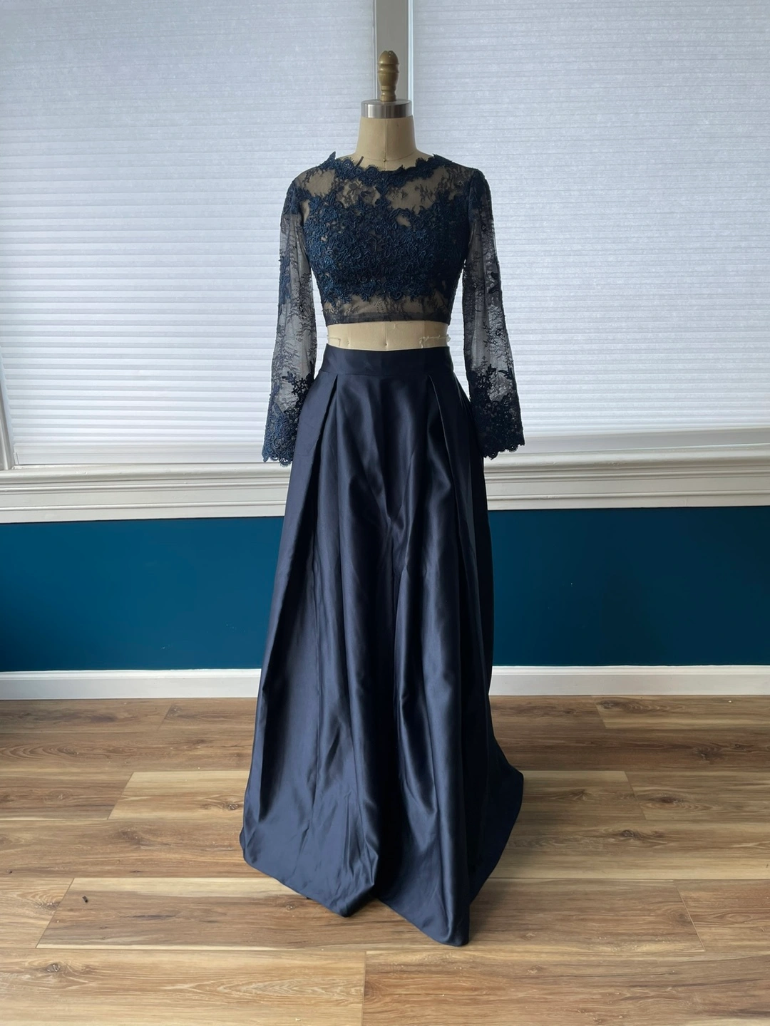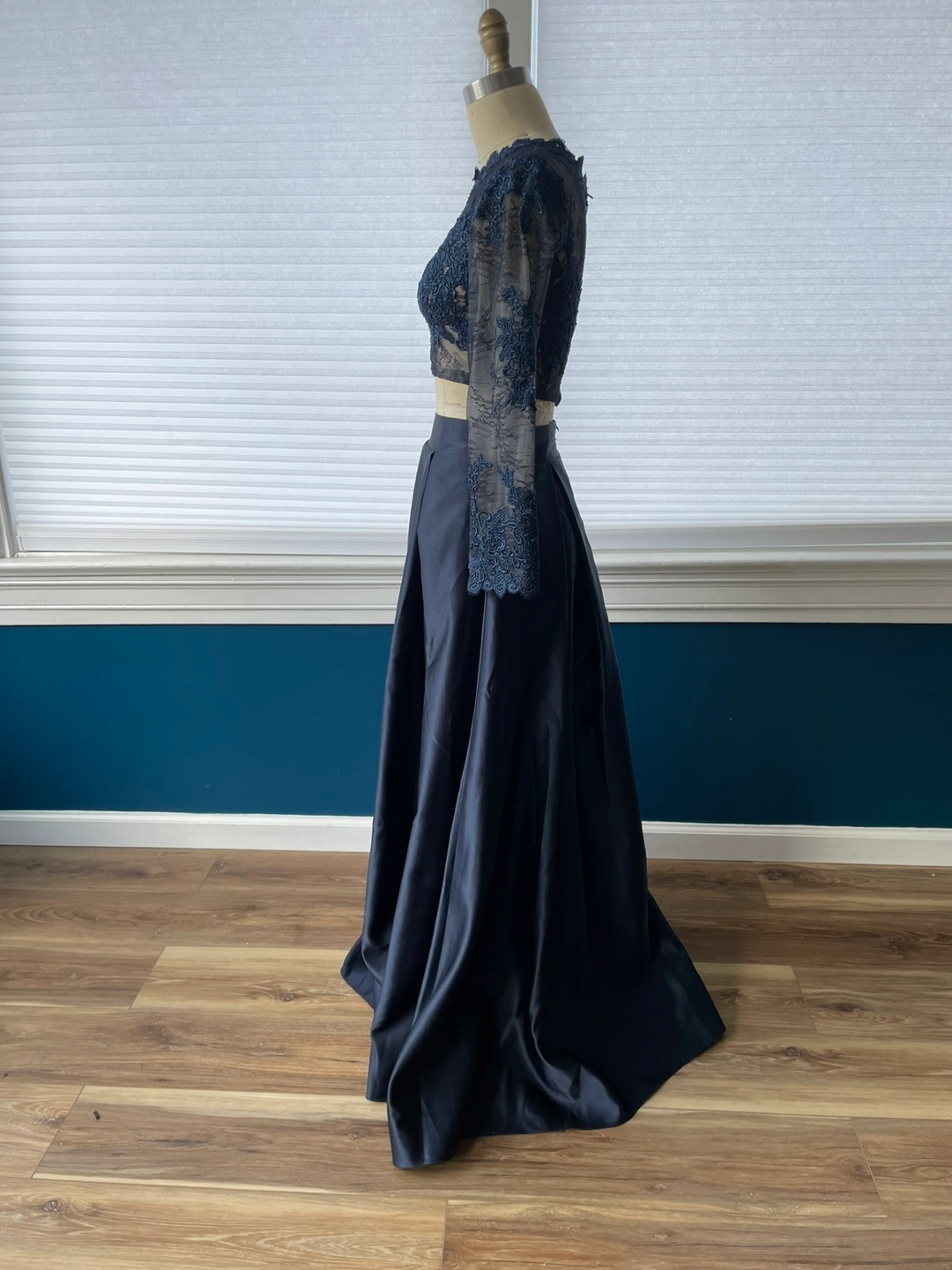 Selling a beautiful 2 piece navy blue formal dress. It features a lace long-sleeve top and a satin skirt. Sash included. Perfect for a special occasion