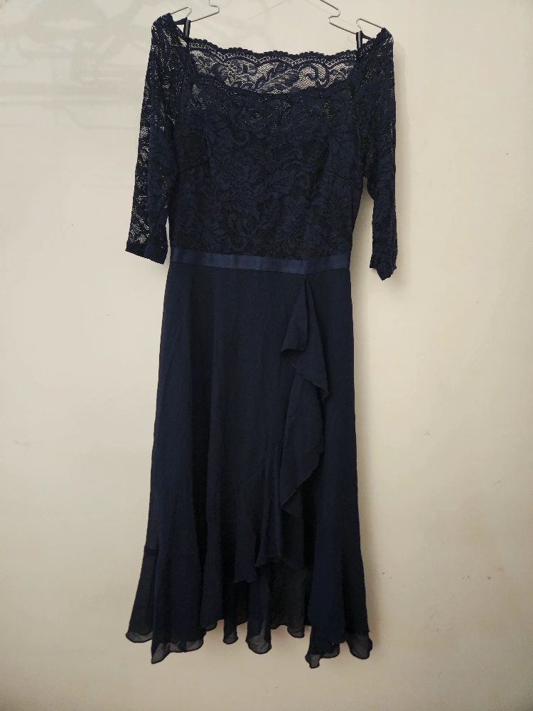 21This is a beautiful navy blue dress with a lace top and 3/4 sleeves. It has a flattering silhouette and is perfect for a special occasion. The dress is in great condition and ready for a new home. I only used them once.