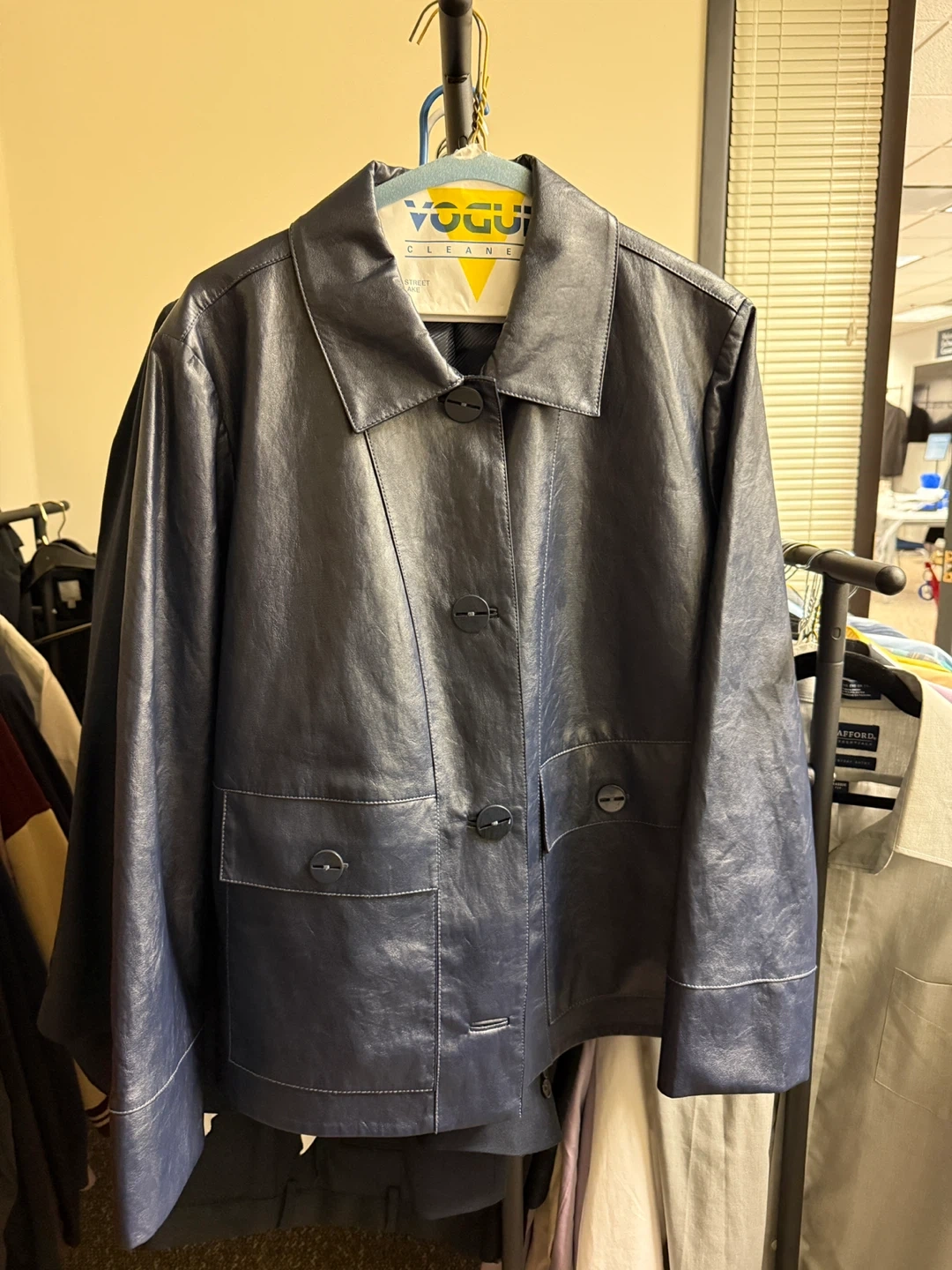 Here's a stylish navy blue leather jacket! It features a classic design with buttons and pockets. The material has a nice texture and the color is a deep navy blue. Perfect for adding a touch of sophistication to any outfit!