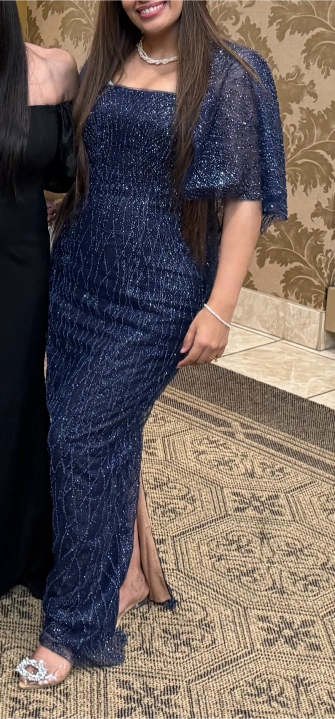 Beautiful navy blue sequin formal dress. Perfect for a special occasion! The dress features a square neckline and a subtle slit. The dress has a cape sleeve.