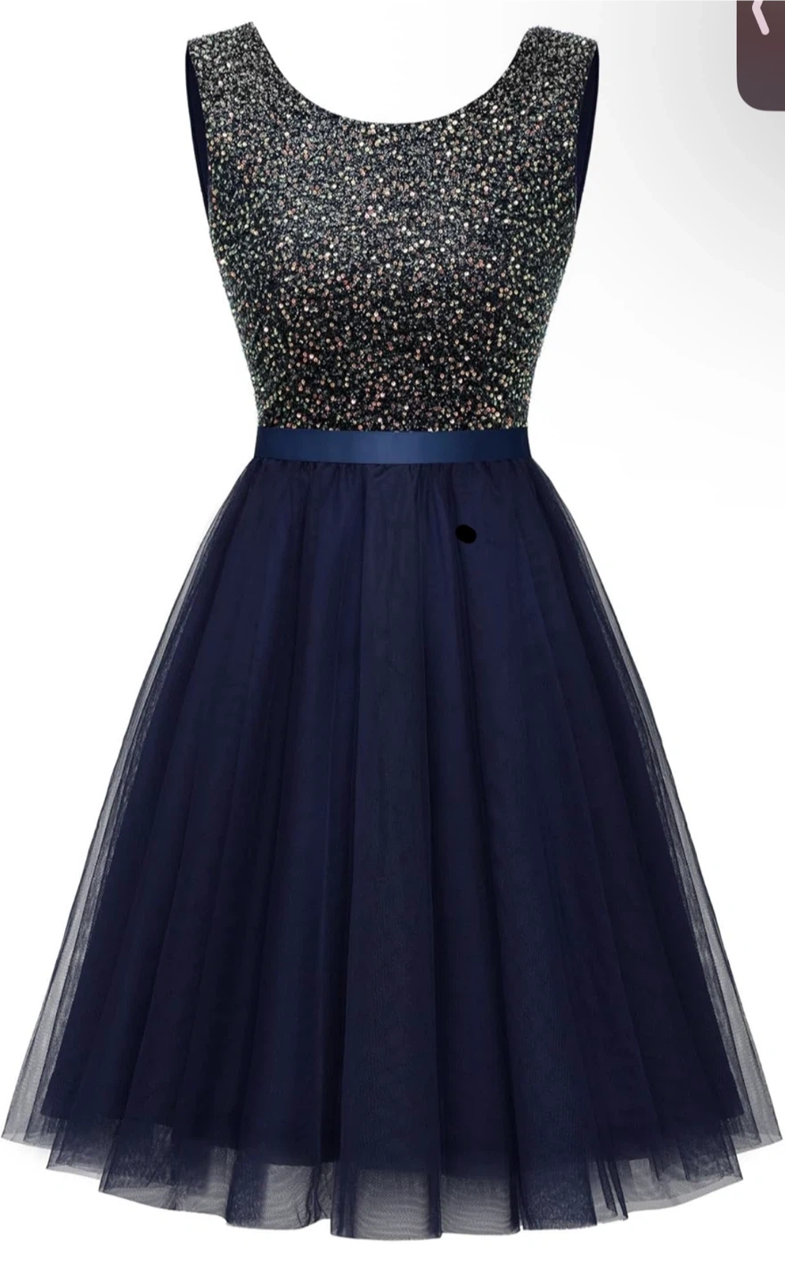 60This is a navy blue dress with a sequin top and tulle skirt. It's perfect for a party or special occasion!