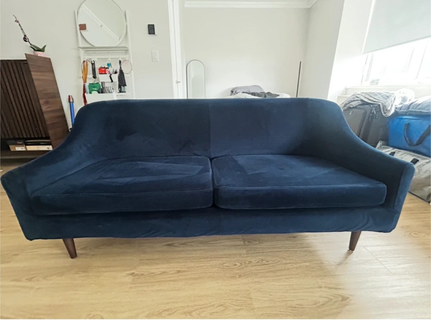 A curvy and compact statement sofa- ideal if you have a smaller living room. The glamorous curves, as well as the sloped arms and back, create a welcoming cocoon of comfort. Comfortably seats 2 people. Seat depth is 23". Had it for 2 years, all covers are washable. It's in great condition and would look great in any living room or den. In elevator building, but will have to arrange pickup.
