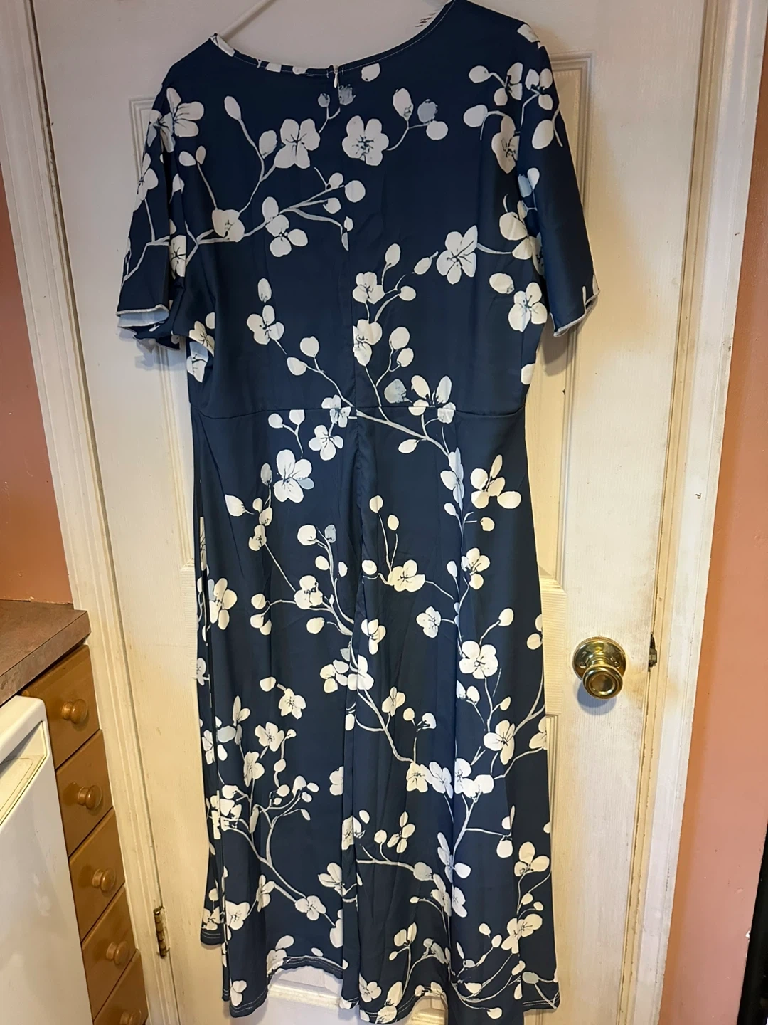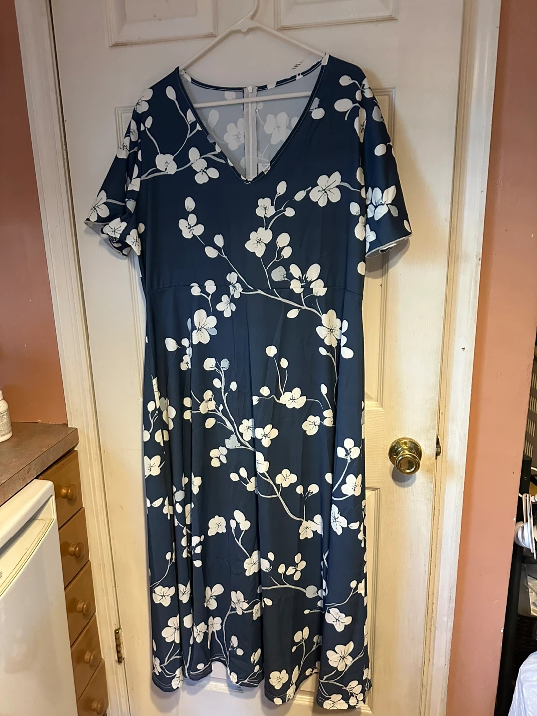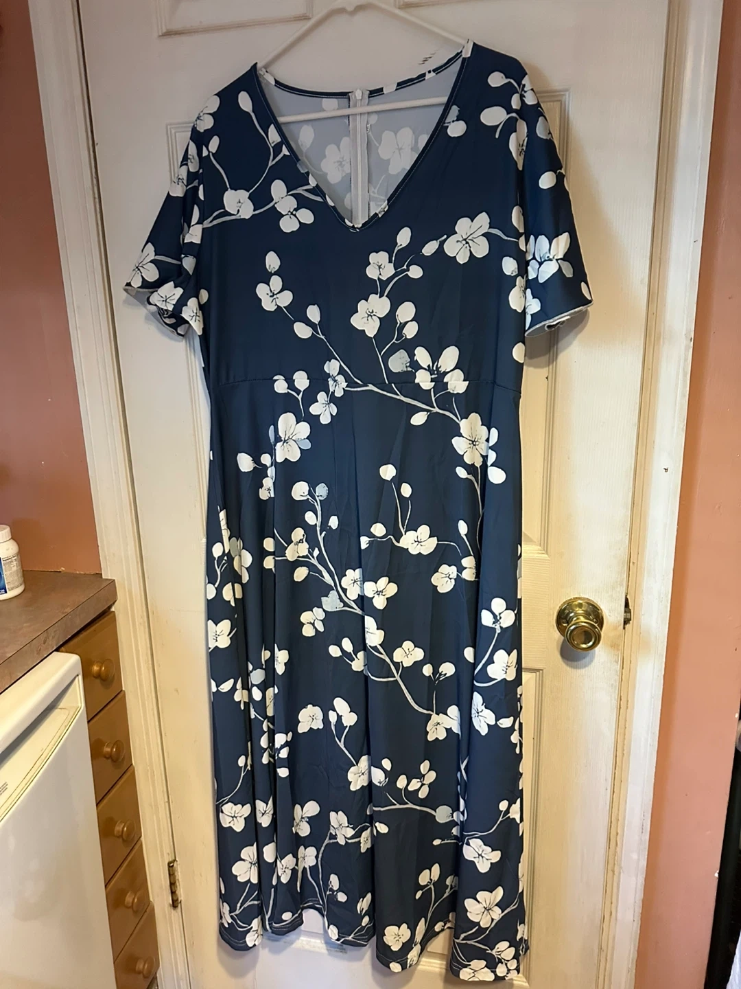 Beautiful navy maxi dress with a white floral pattern! It's a size 2XL. Flutter sleeves. Has zipper back. Perfect for a summer day or a special occasion! BRAND NEW!