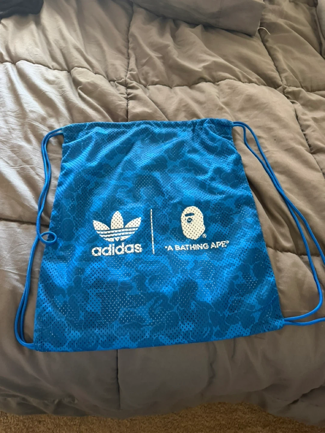 This is a blue drawstring bag featuring a collaboration between Adidas and A Bathing Ape (BAPE). It has a mesh-like texture with a repeating BAPE camouflage pattern. The bag has adjustable shoulder straps that double as a drawstring closure.