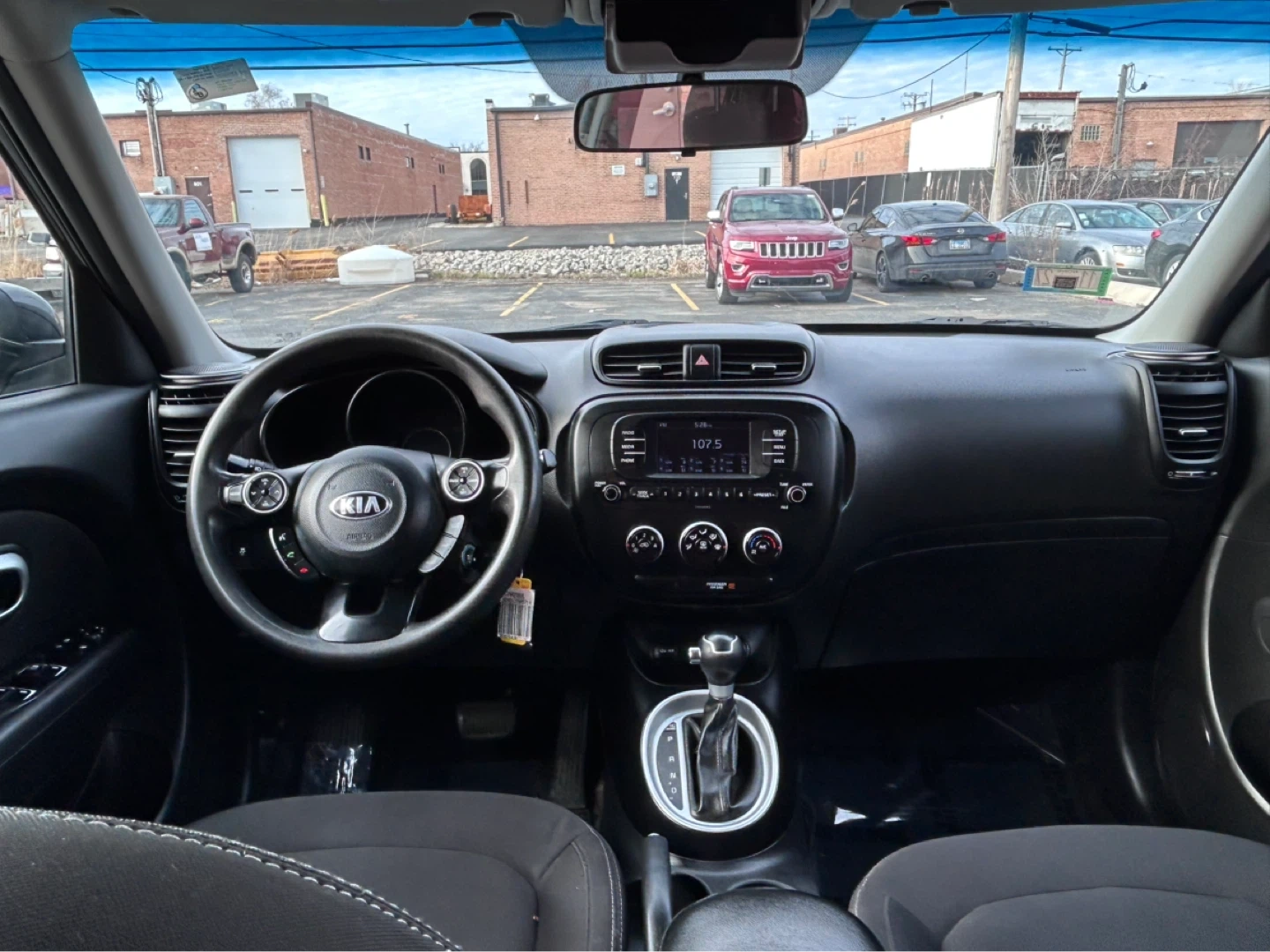 This is a black Kia Soul with 116,522 miles. It has a 1.6L GDI engine. The interior features a touchscreen infotainment system and comfortable seating.