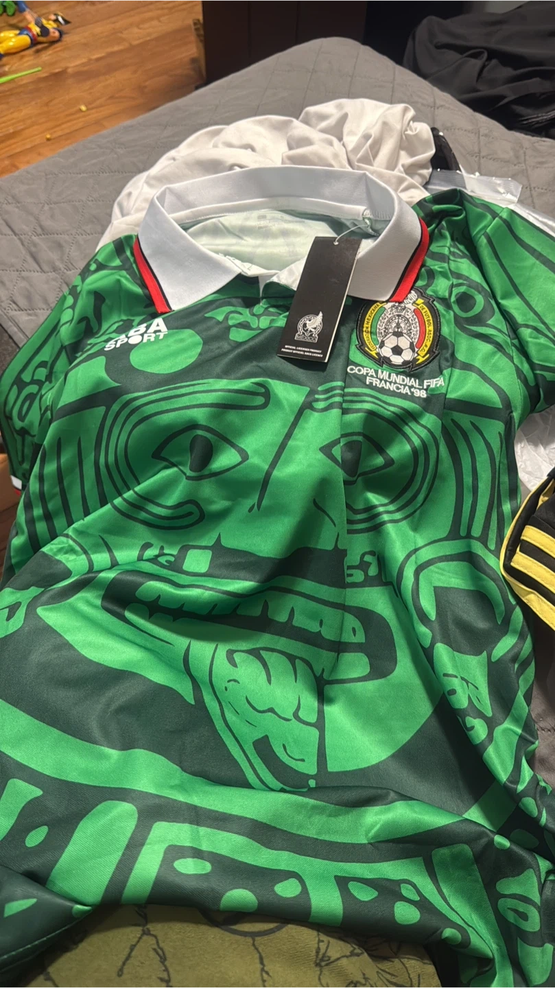 Selling a SABA Sport Mexico FIFA '98 jersey. It's green with a unique design. The jersey appears to be in new condition with tags attached!