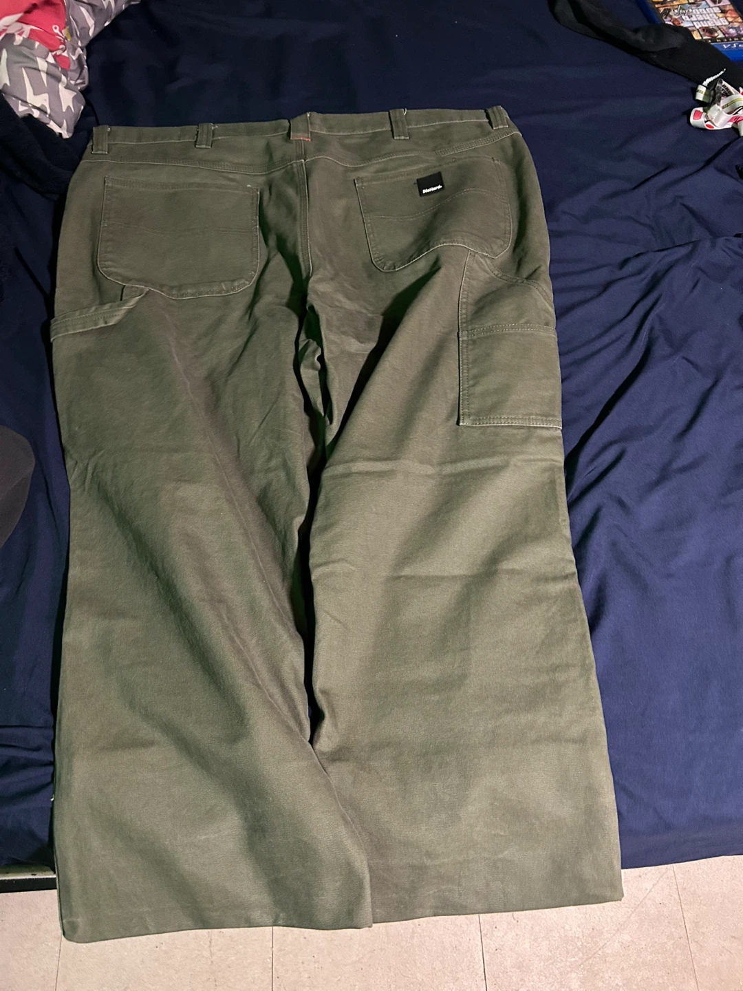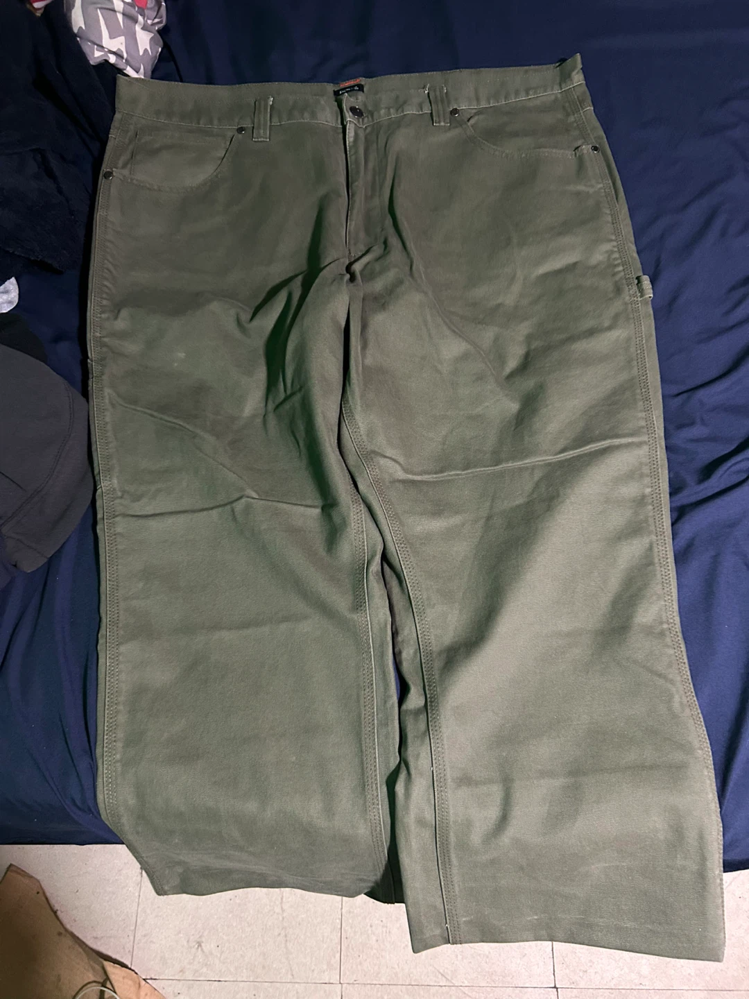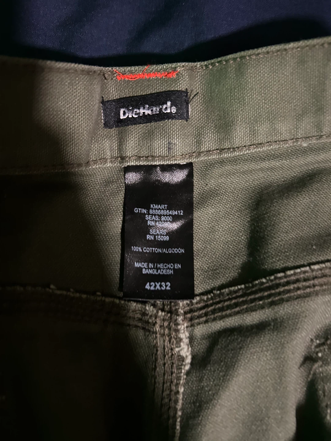 DieHard men's carpenter pants in a size 42x32. These are made from 100% cotton. They're a durable olive green color. Perfect for work or casual wear!