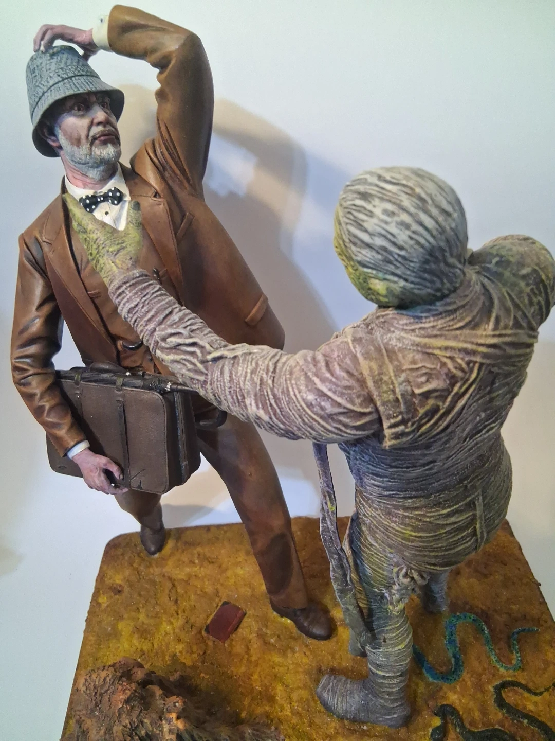 A diorama featuring two figures. Each is a foot tall and mounted on a wooden base. Both figures are out of production
