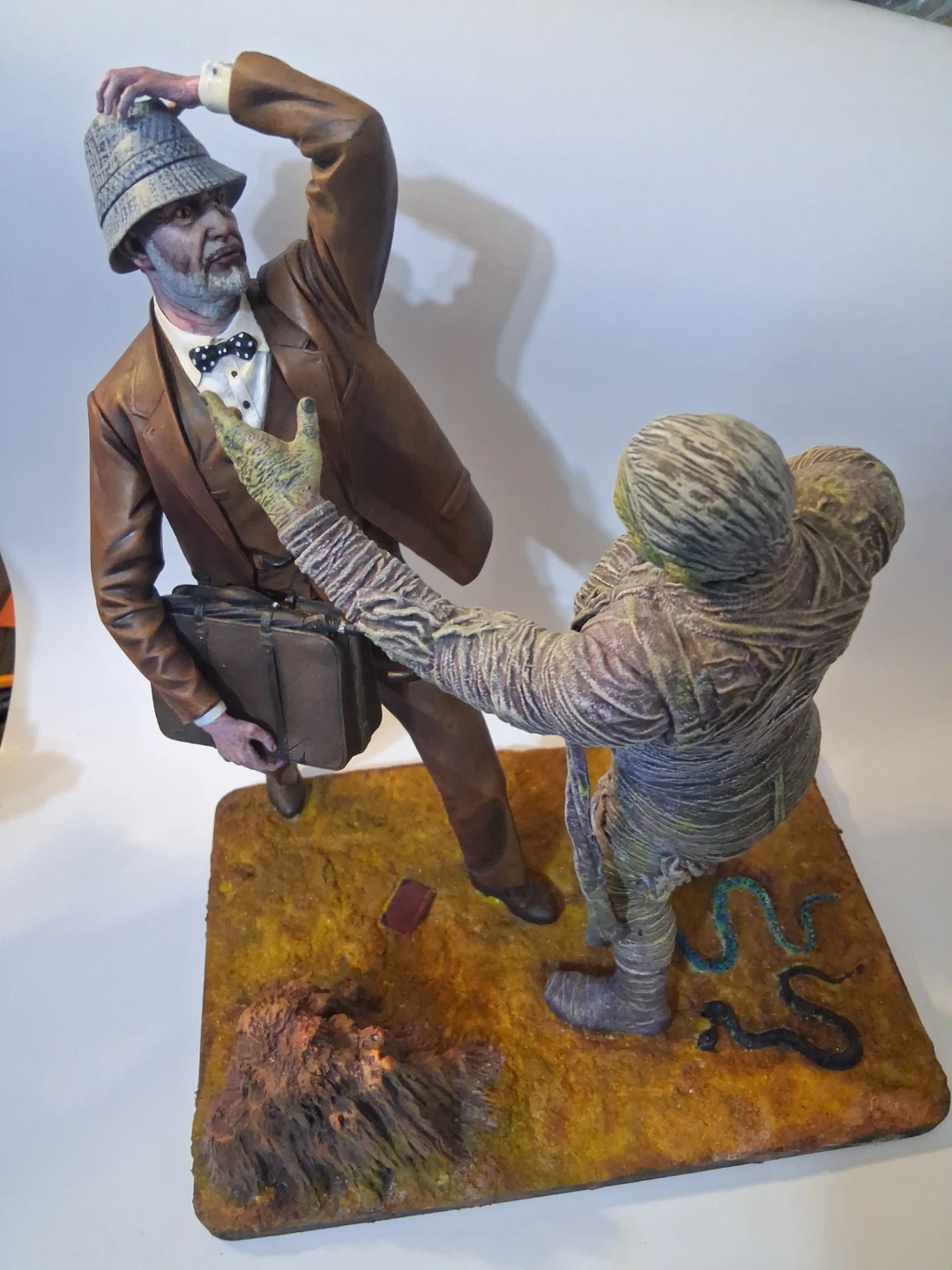 A diorama featuring two figures. Each is a foot tall and mounted on a wooden base. Both figures are out of production