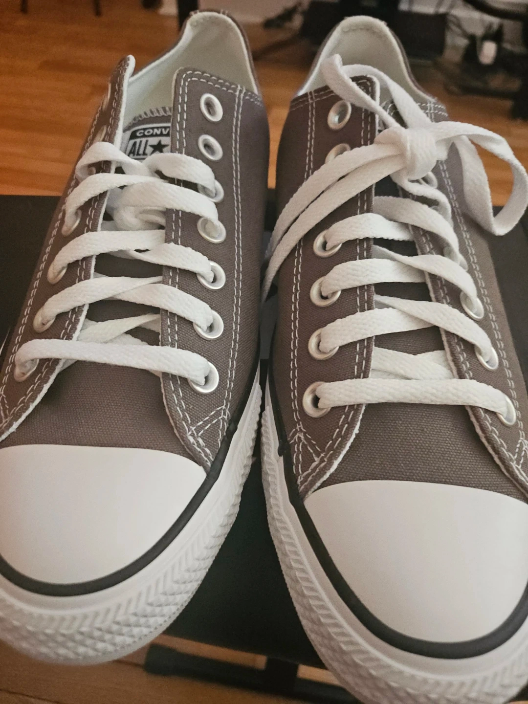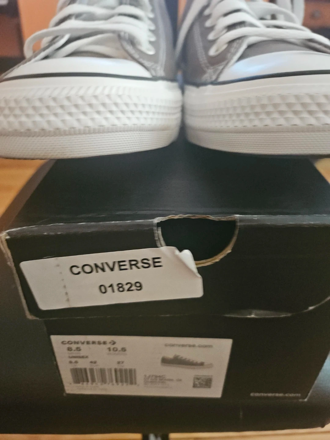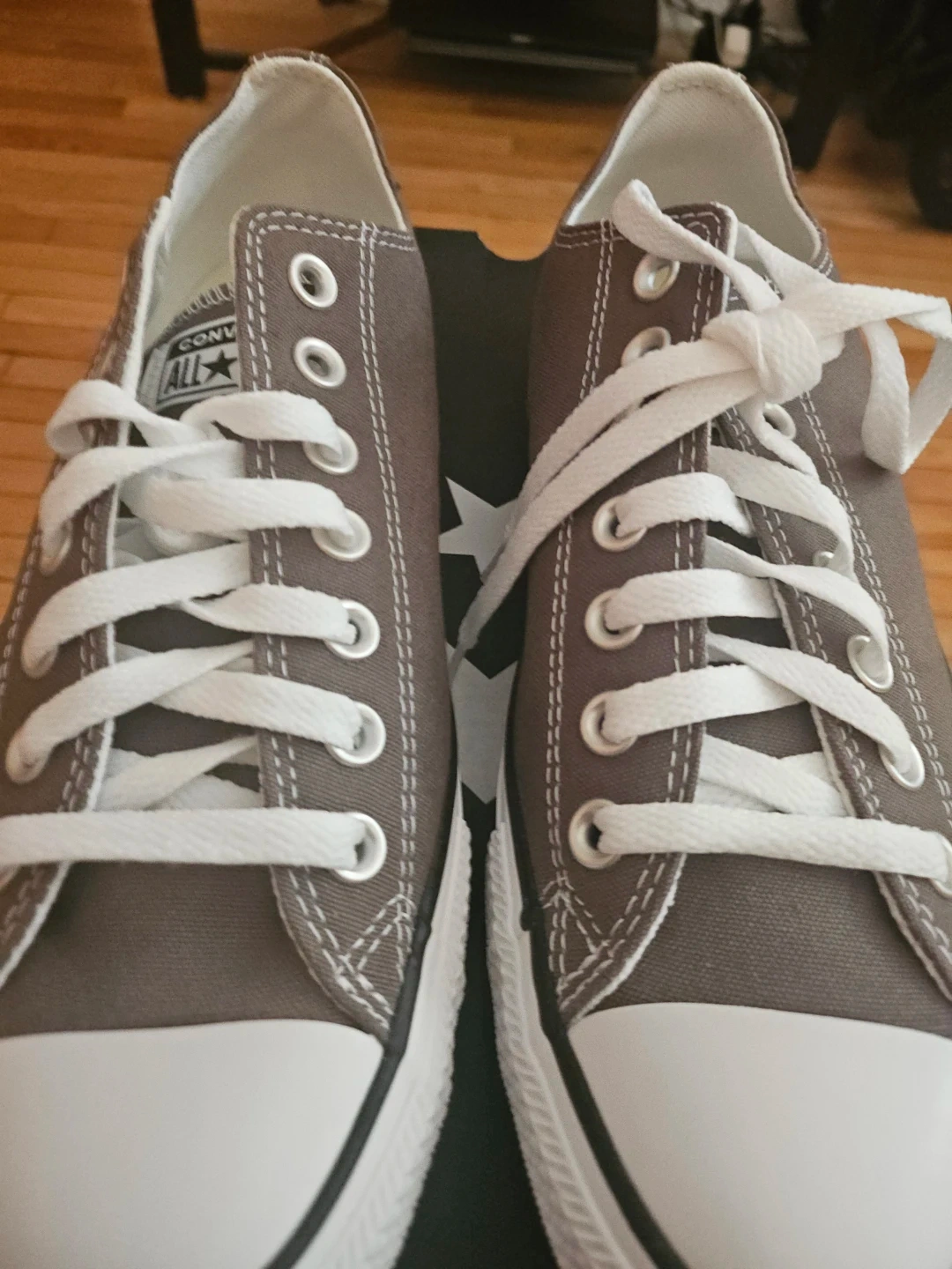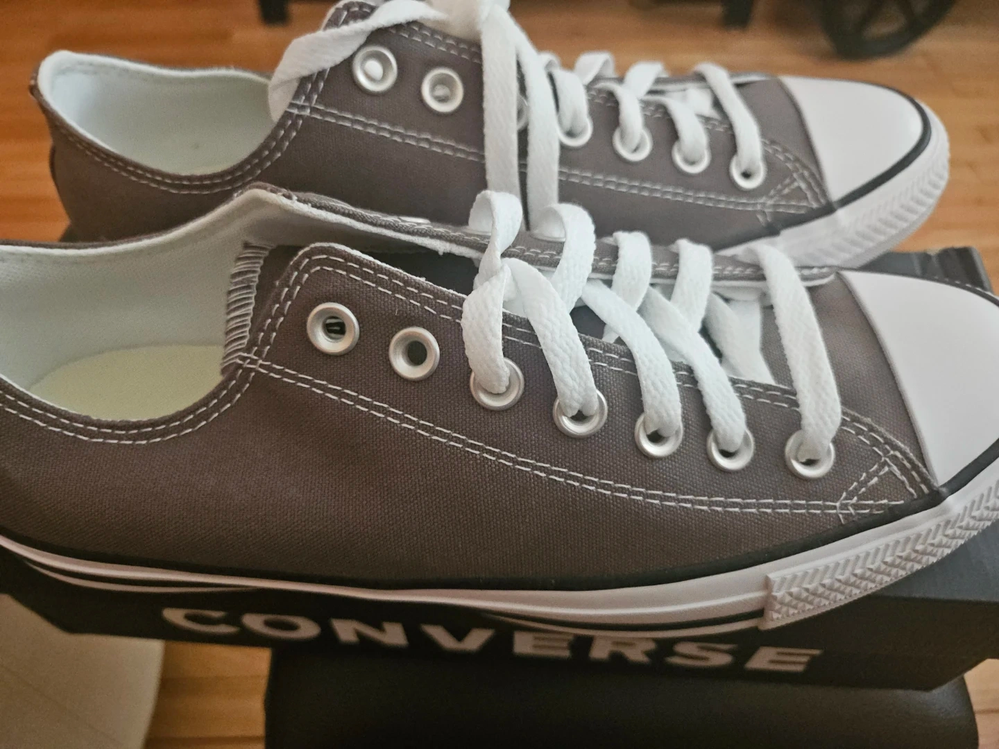 Classic Converse Chuck Taylor All Star low top sneakers in a versatile gray color. Features canvas upper, rubber toe cap, and lace-up closure. Includes original box. Size is W 10.5- M 8.5