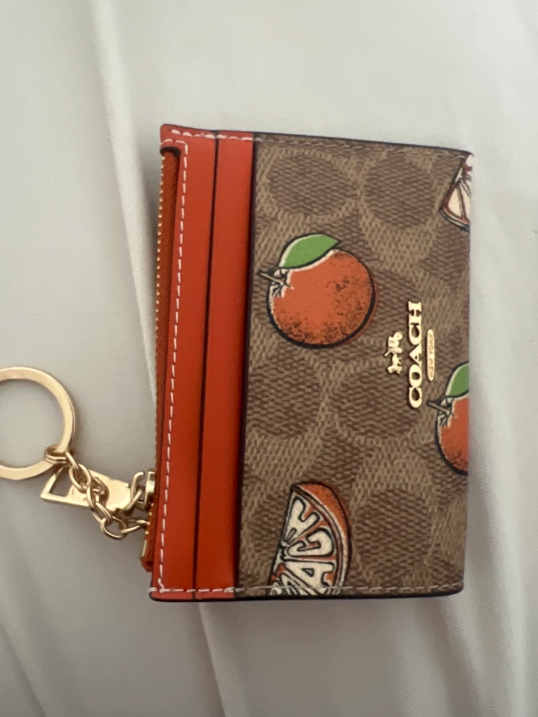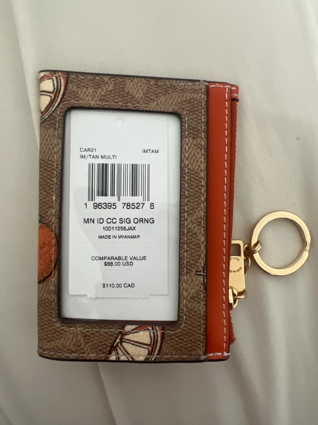This Coach card case is in new condition! It features an orange print on a signature Coach background. The color is tan/multi with orange accents. There's a key ring attached, perfect for carrying your essentials. Retails for $88 USD