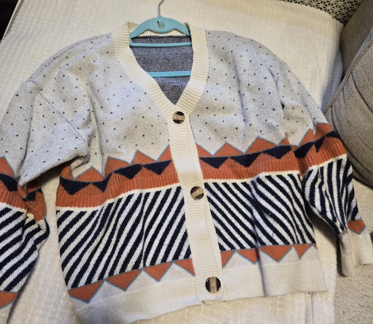 Cozy button-up cardigan with a cream base and a colorful geometric pattern. A stylish layering piece for cooler days! (Only worn once!)