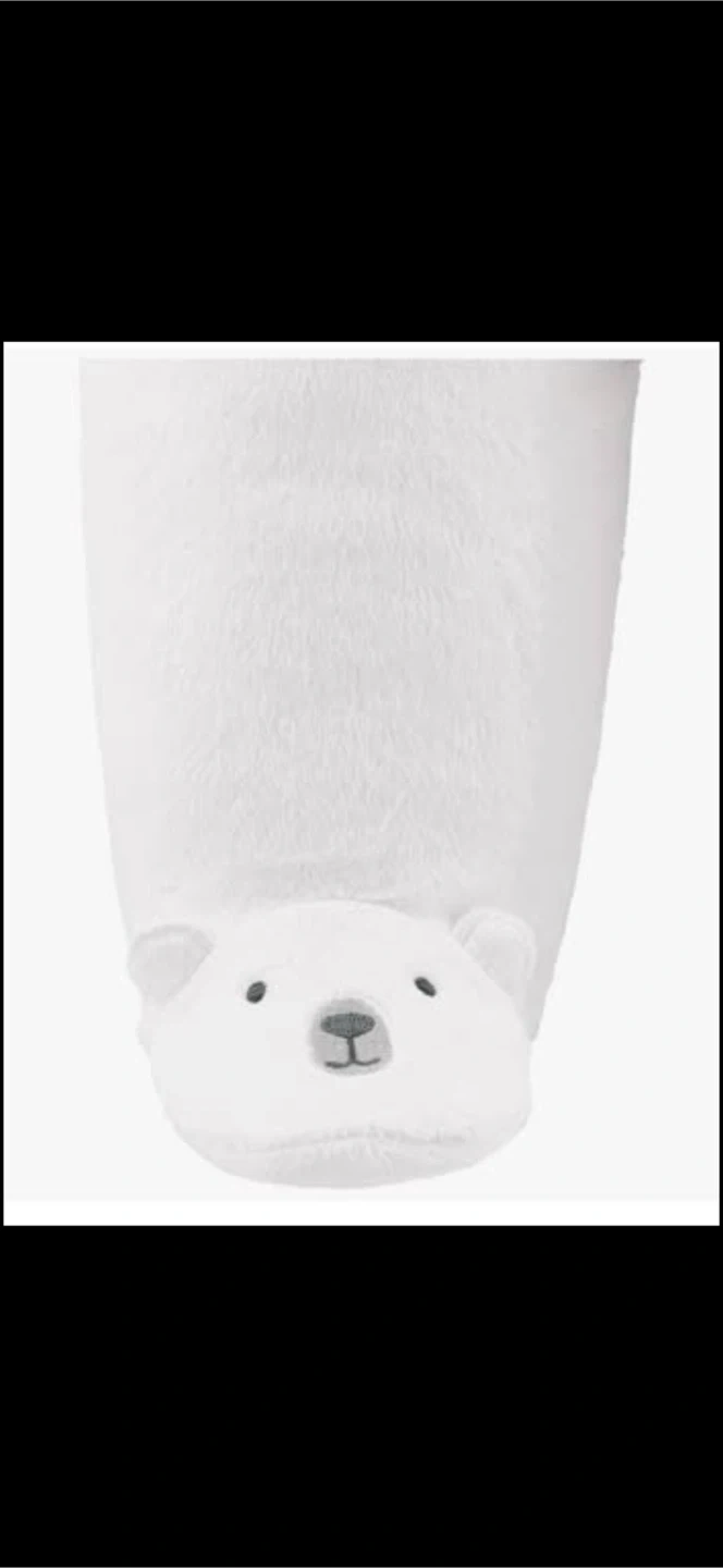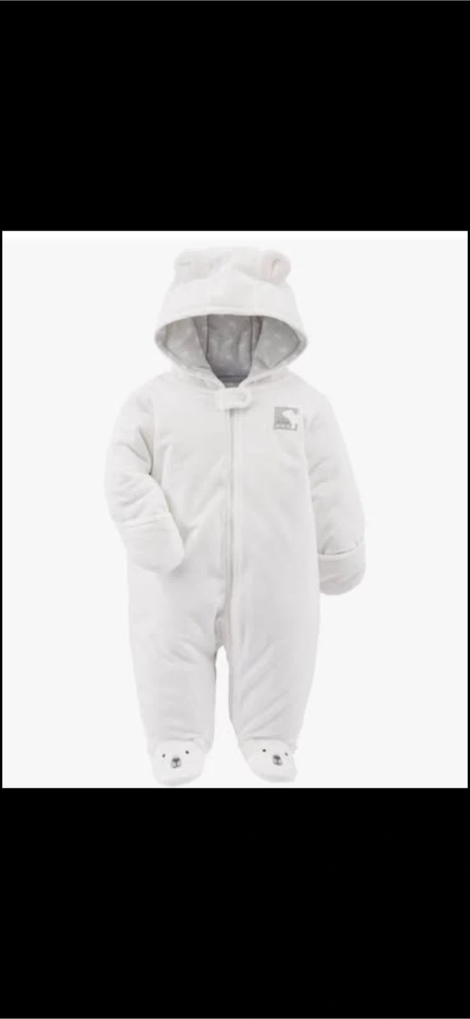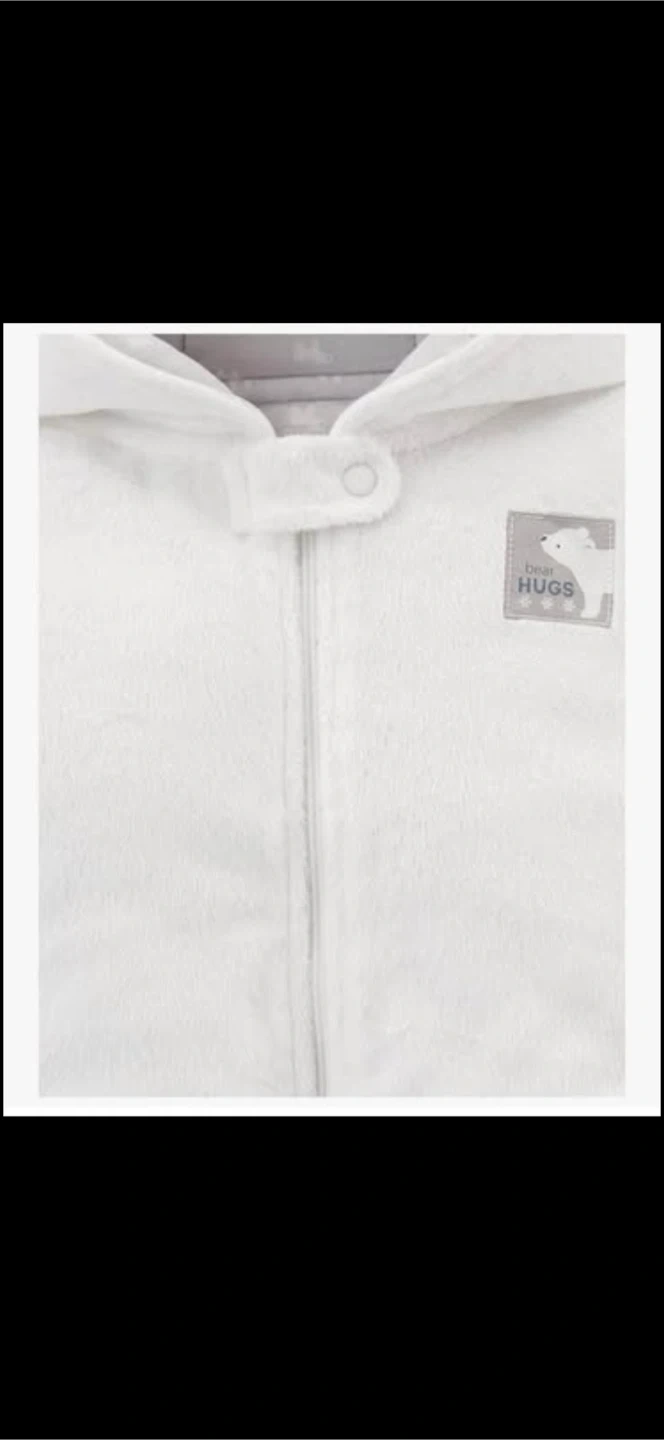 White plush snowsuit with a hood and bear detailing on the feet. Features a full zip front closure. Adorable "Bear Hugs" embroidered patch on the chest.