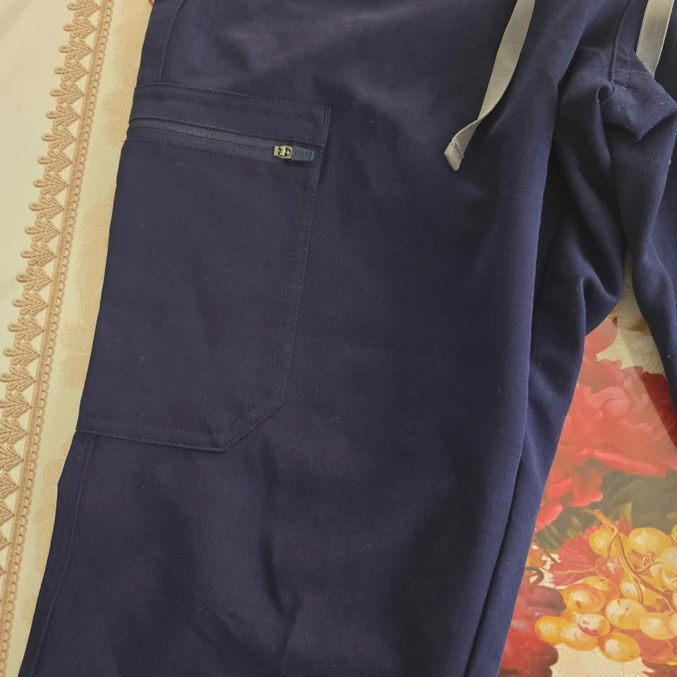 Has one cargo zip pocket on the front right leg. Please see the last picture for material details. Please see pictures for size/measurements. Item is stored in a smoke-free and pet-free environment. Cash only and no returns. Must pick up.