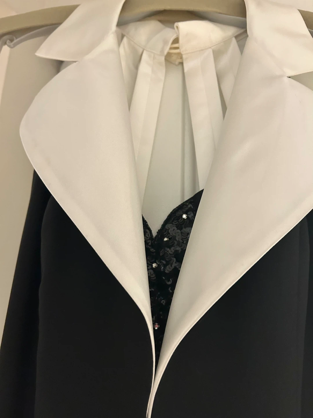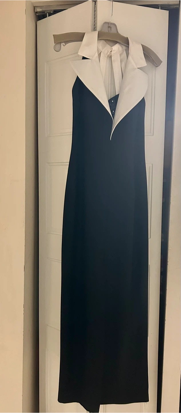 Selling a beautiful long (56”, 46 + 8’ ) black evening dress with a white collar and accents! It's in great condition and perfect for a formal event. The dress is a sleek, classic style that will turn heads. Sexy Front slit up the middle - just shy of 24” (2 “). Only worn once.