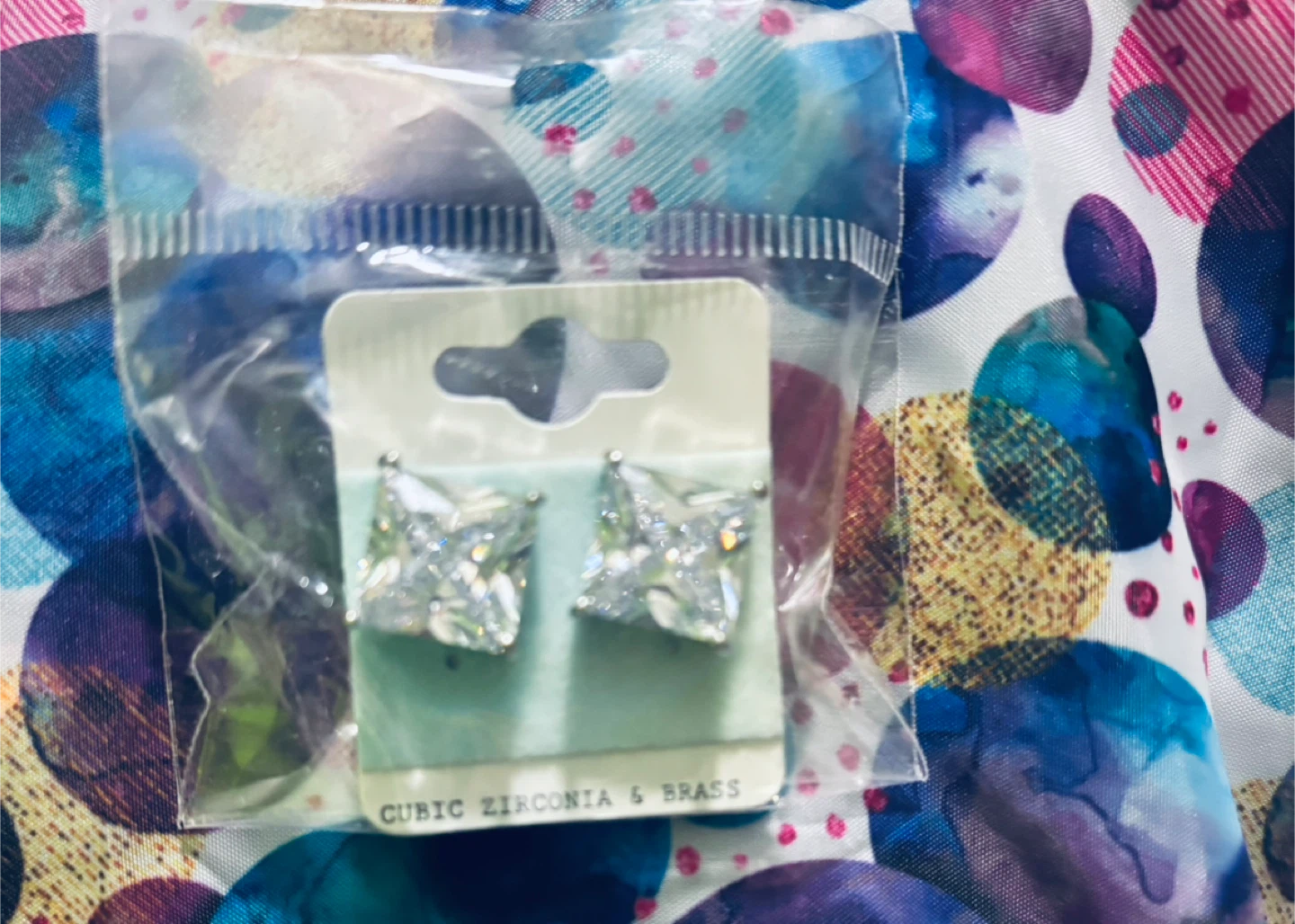A pair of square-cut cubic zirconia stud earrings set in brass. They're presented on a card and still in their original packaging. These earrings add a touch of sparkle!