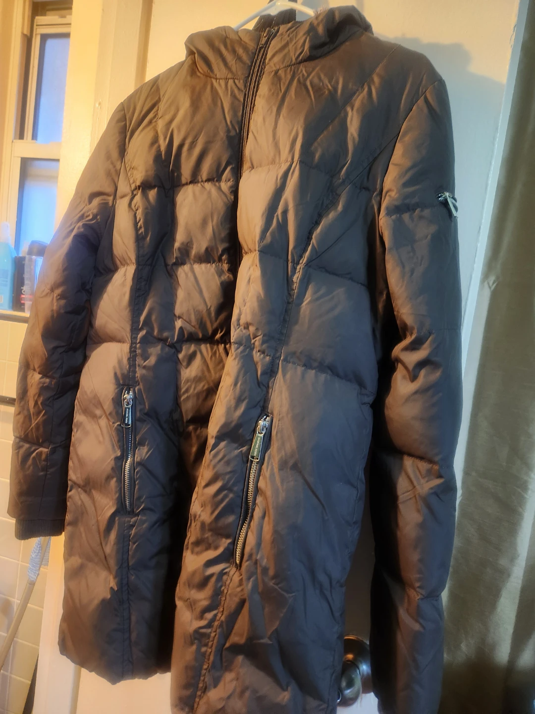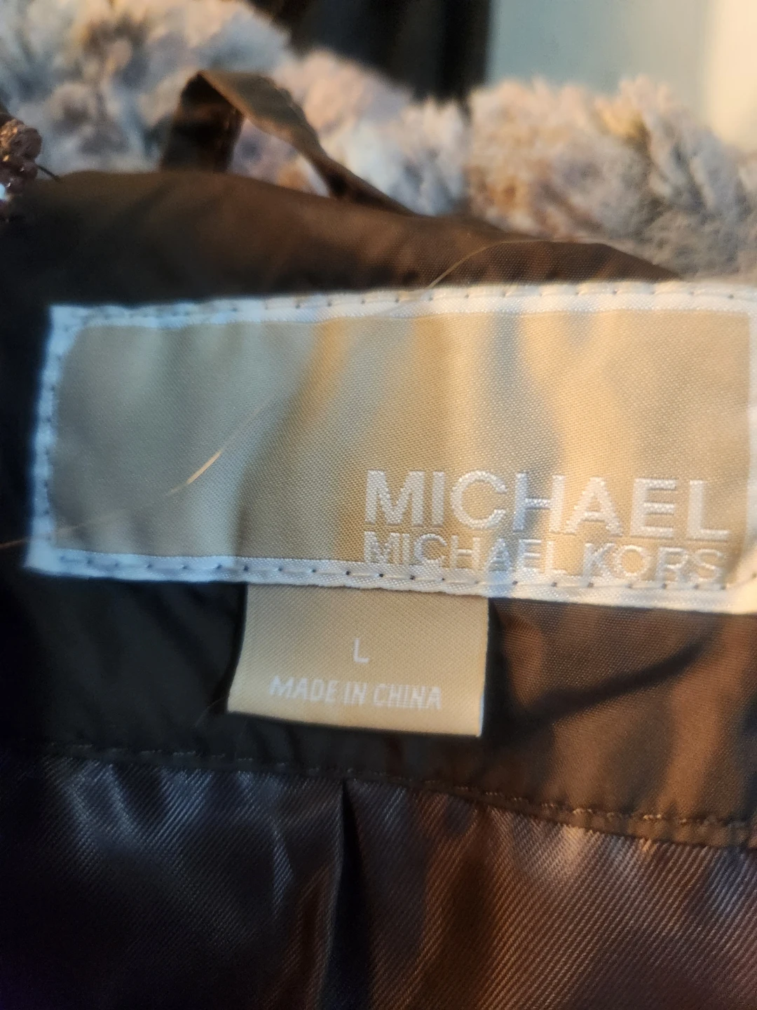 Michael Michael Kors brown puffer coat. Hooded design with zip-up closure and front pockets. Material is polyester. Size is L. Made in China.