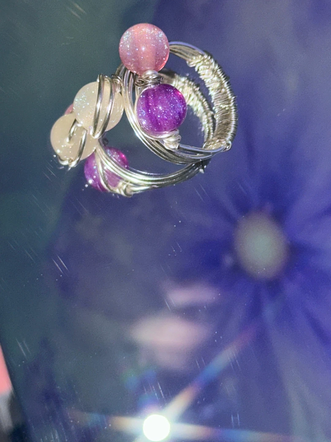 This ring features a wire-wrapped design with sparkly purple and pinkish-white beads. The band is made of silver-tone wire. It's a unique accessory!