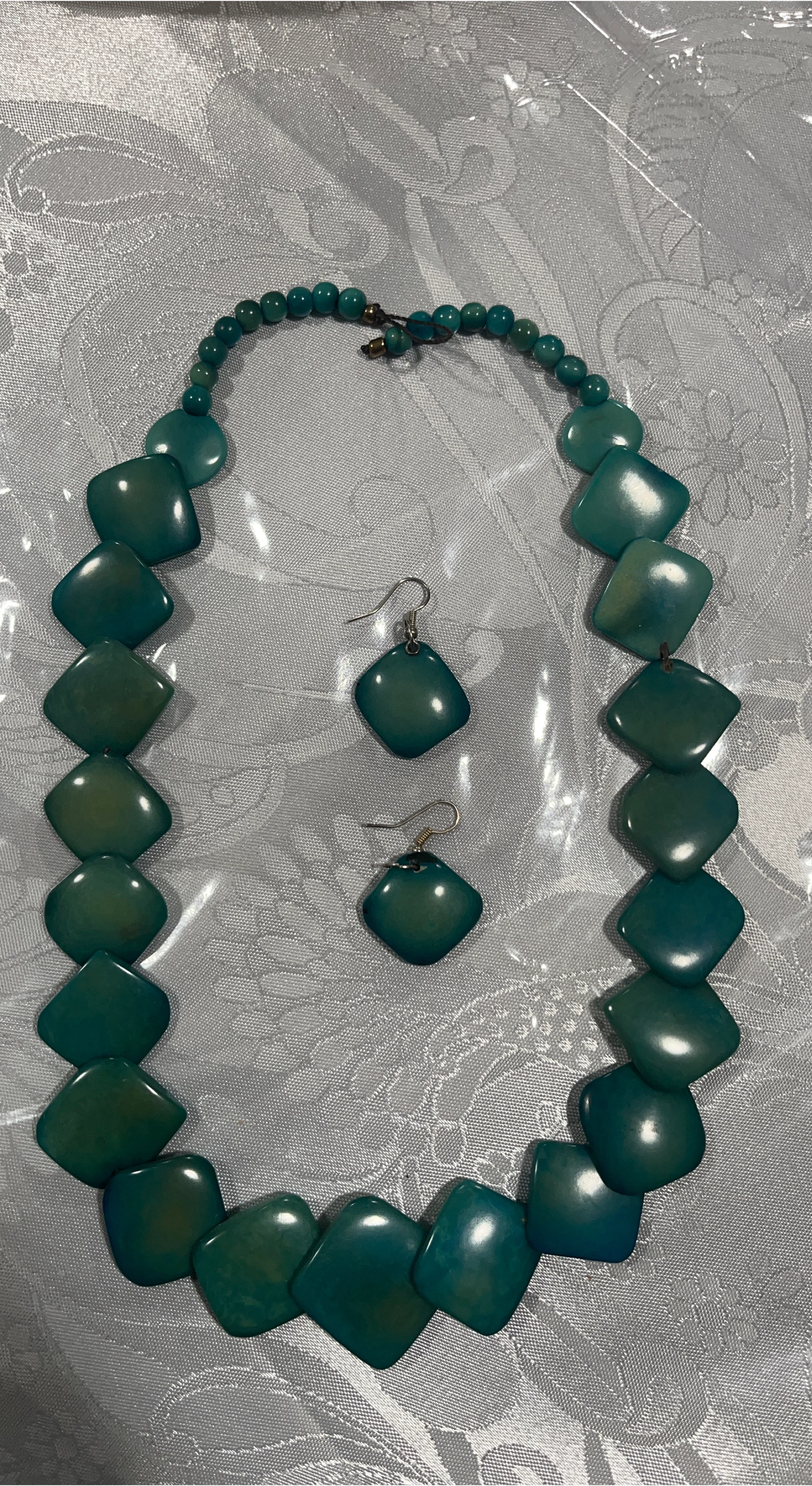 60A beautiful matching necklace and earrings set in a lovely shade of green. The necklace features square beads, and the earrings are a simple, elegant design. Perfect for adding a pop of color to any outfit!