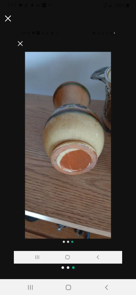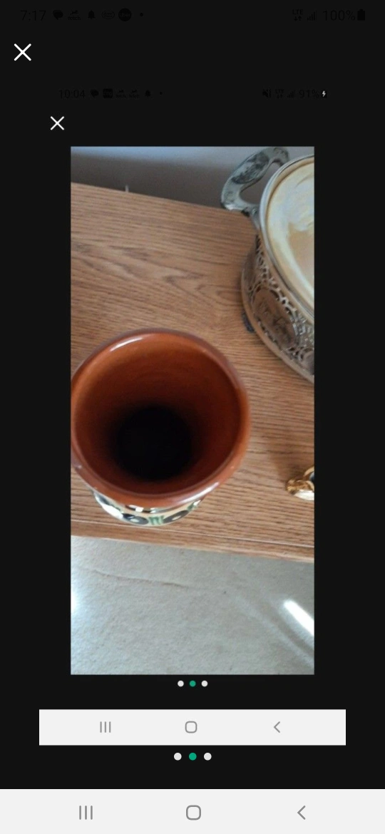 Tuscan style terracotta hand thrown Red Pottery Vase w Painted Design. No chips or cracks. Nice painted design w greens & brown. Very nice piece. Item is approx. 6.5” tall & 3” wide. Colorful piece.