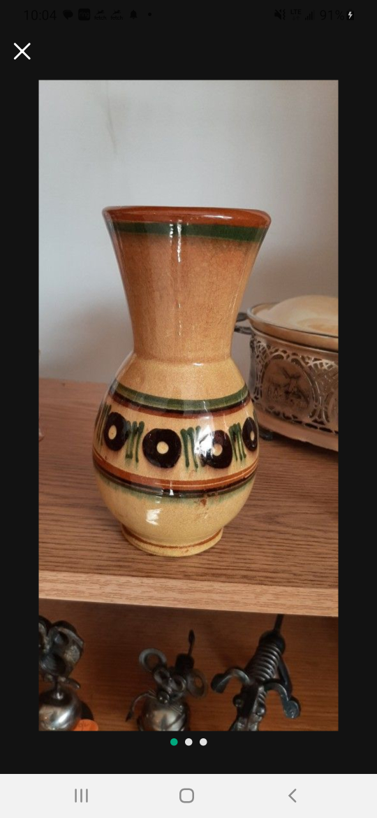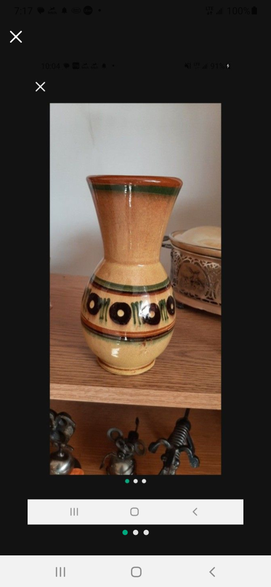 Tuscan style terracotta hand thrown Red Pottery Vase w Painted Design. No chips or cracks. Nice painted design w greens & brown. Very nice piece. Item is approx. 6.5” tall & 3” wide. Colorful piece.
