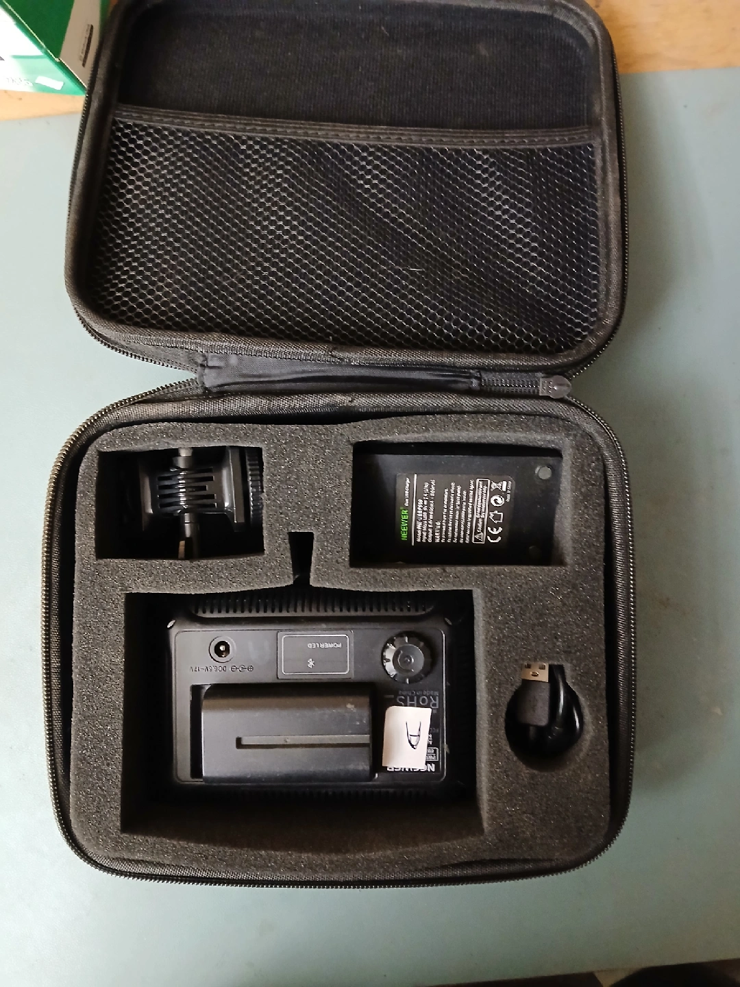 Selling a Neewer LED video light that comes with its carrying case! It includes the battery, charger, converter base and diffuser, charger kits, and manual