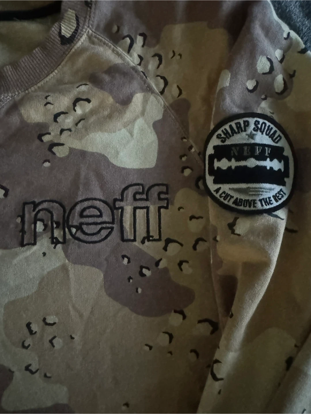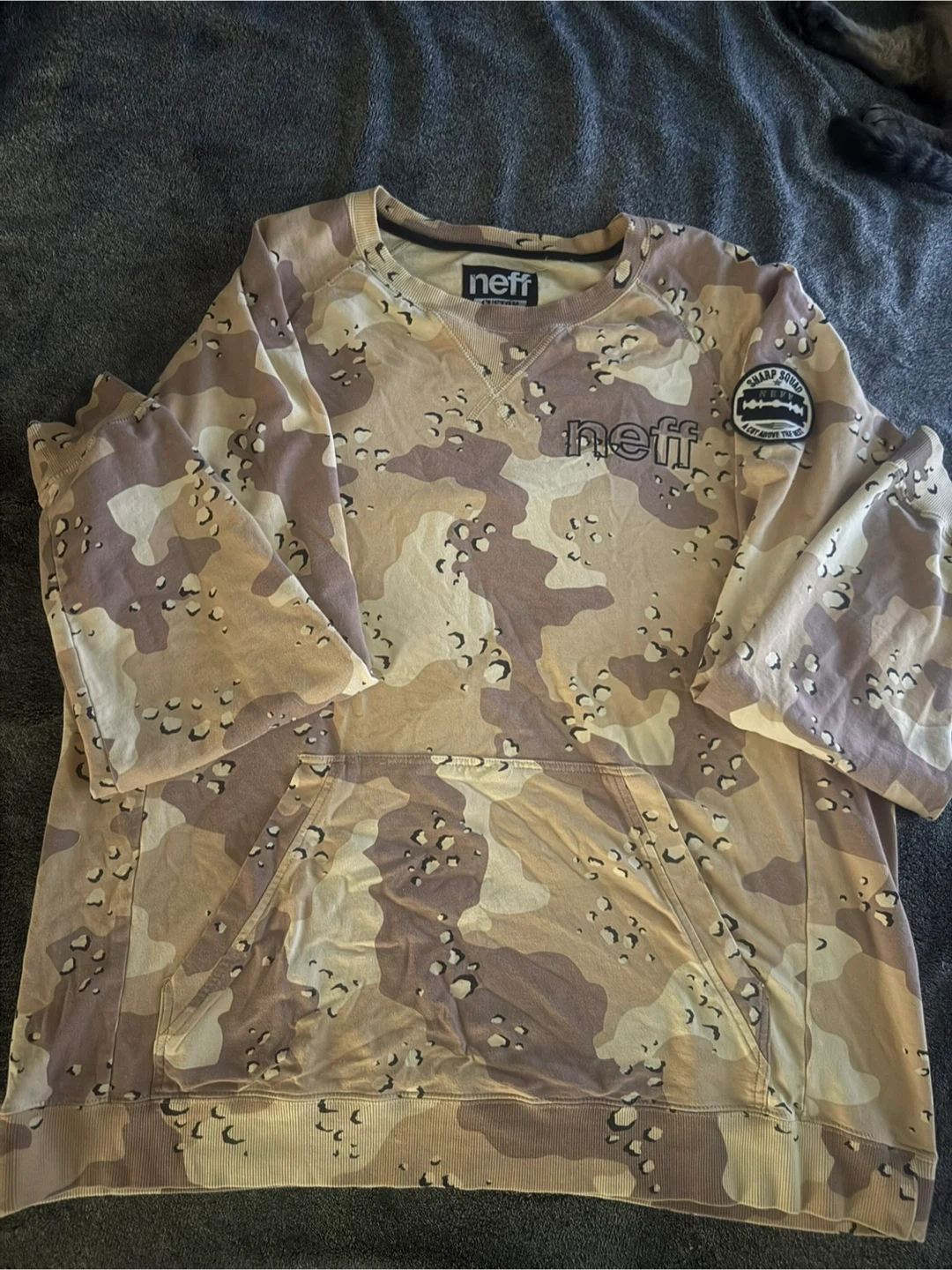Selling a Neff sweatshirt in size XL with a cool camo pattern! It has a front pocket and a patch on the sleeve that says "Sharp Squad". It's in great condition and ready for a new home.