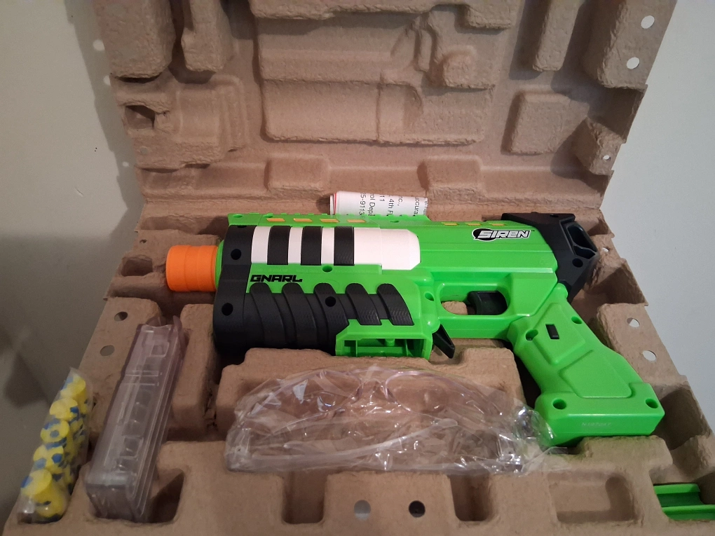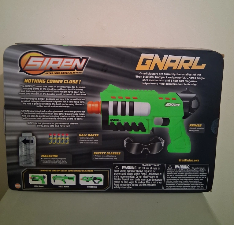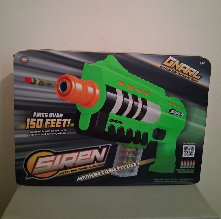 selling this dart gun called a siren gnarl on the box it says it can shoot over 150 feet perfect for someone who likes nerf guns. open for trades.