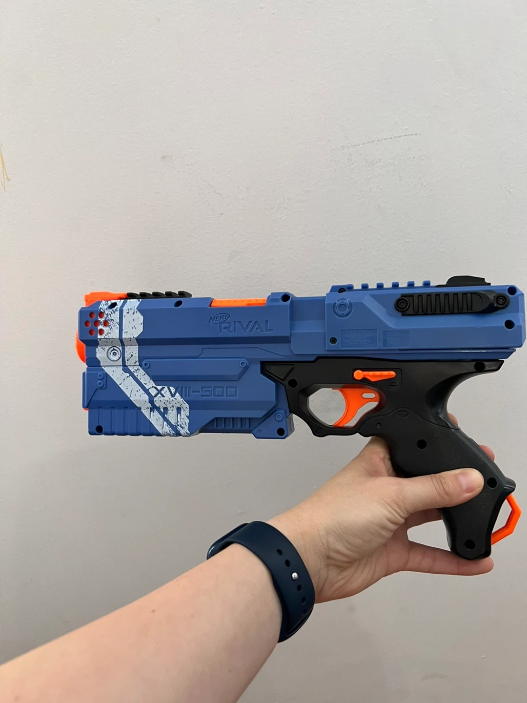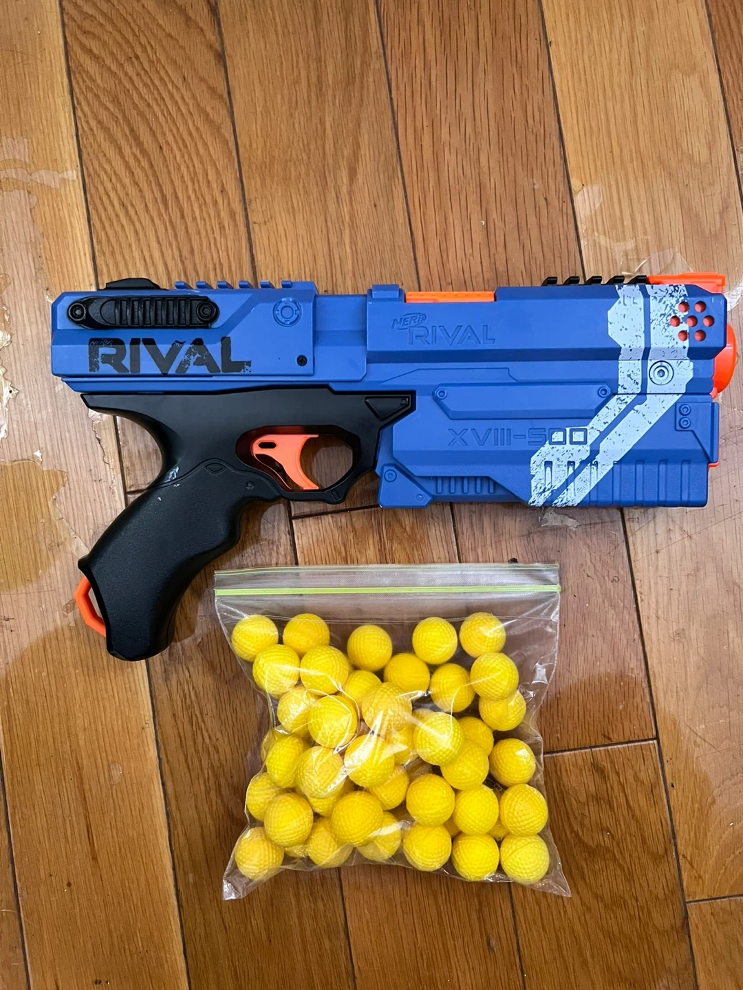 Selling a Nerf Rival XVIII-500 blaster in blue! It comes with a bag of yellow Nerf Rival balls. Ready for some action!