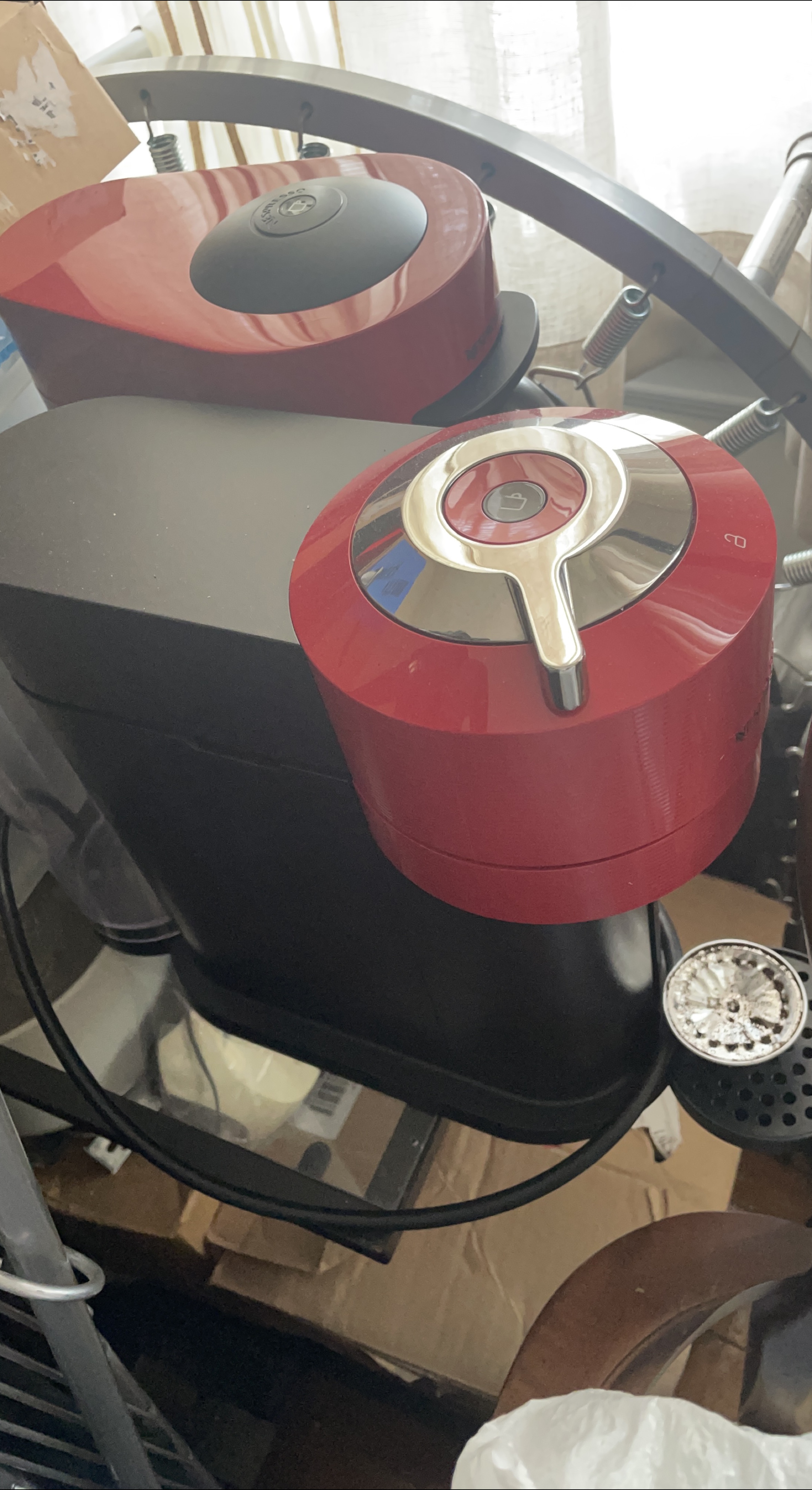 Selling a Nespresso coffee machine in red and black! It's in good condition and ready to make some delicious coffee