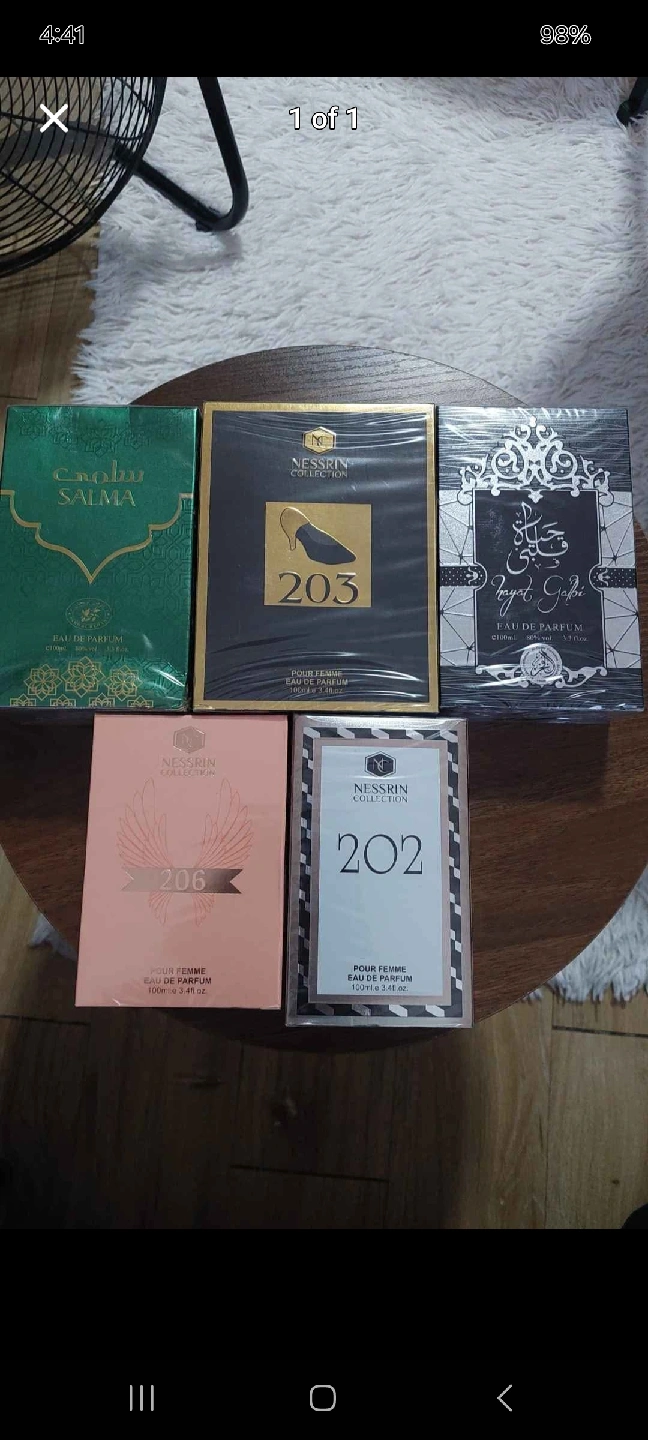 26Selling a collection of Nessrin perfumes! The collection includes Salma, 203, Hayat Galbi, 206, and 202. Each bottle contains 100ml / 3.4 fl oz of eau de parfum. They are all for femme. $6 each on sale